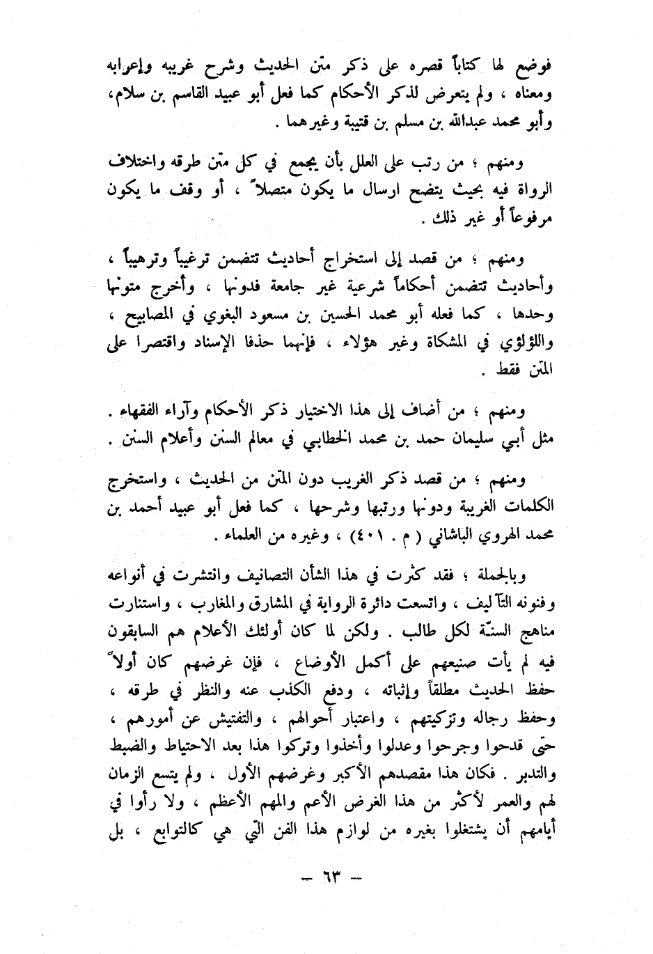 وَبِالْجُمْلَةِ فقد كثرت فِي هَذَا الشَّأْن التصانيف وانتشرت فِي أَنْوَاعه وفنونه التآليف واتسعت دَائِرَة الرِّوَايَة فِي الْمَشَارِق والمغارب واستنارت مناهج السّنة لكل طَالب وَلَكِن لما كَانَ أُولَئِكَ الْأَعْلَام هم السَّابِقُونَ فِيهِ لم يَأْتِ صنيعهم على أكمل الأوضاع فَإِن غرضهم كَانَ أَولا حفظ الحَدِيث مُطلقًا وإثباته وَدفع الْكَذِب عَنهُ وَالنَّظَر فِي طرقه وَحفظ رِجَاله وتزكيتهم وَاعْتِبَار أَحْوَالهم والتفتيش عَن أُمُورهم حَتَّى قَدَحُوا وجرحوا وَعدلُوا وَأخذُوا وَتركُوا هَذَا بعد الِاحْتِيَاط والضبط والتدبر فَكَانَ هَذَا مقصدهم الْأَكْبَر وغرضهم الأول وَلم يَتَّسِع الزَّمَان لَهُم والعمر لأكْثر من هَذَا الْغَرَض الْأَعَمّ والمهم الْأَعْظَم وَلَا رَأَوْا فِي أيامهم أَن يشتغلوا بِغَيْرِهِ من لَوَازِم هَذَا الْفَنّ الَّتِي هِيَ كالتوابع بل