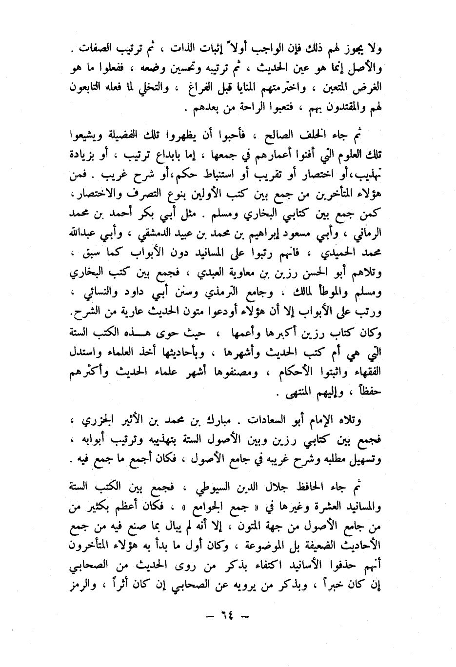 ثمَّ جَاءَ الْخلف الصَّالح فأحبوا أَن يظهروا تِلْكَ الْفَضِيلَة ويشيعوا تِلْكَ الْعُلُوم الَّتِي أفنوا أعمارهم فِي جمعهَا إِمَّا بإبداع تَرْتِيب أَو بِزِيَادَة تَهْذِيب أَو اخْتِصَار أَو تقريب أَو استنباط حكم أَو شرح غَرِيب فَمن هَؤُلَاءِ الْمُتَأَخِّرين من جمع بَين كتب الْأَوَّلين بِنَوْع التَّصَرُّف والاختصار كمن جمع بَين كتابي البُخَارِيّ وَمُسلم مثل أبي بكر أَحْمد بن مُحَمَّد الرماني وَأبي مَسْعُود إِبْرَاهِيم بن مُحَمَّد بن عبيد الدمقشي وَأبي عبد الله مُحَمَّد الْحميدِي فَإِنَّهُم رتبوا على المسانيد دون الْأَبْوَاب كَمَا سبق وتلاهم أَبُو الْحسن رزين بن مُعَاوِيَة الْعَبْدي فَجمع بَين كتب البُخَارِيّ وَمُسلم والموطأ لمَالِك وجامع التِّرْمِذِيّ وَسنَن أبي دَاوُد وَالنَّسَائِيّ ورتب على الْأَبْوَاب إِلَّا أَن هَؤُلَاءِ أودعوا متون الحَدِيث عَارِية من الشَّرْح وَكَانَ كتاب رزين أكبرها وأعمها حَيْثُ حوى هَذِه الْكتب السِّتَّة الَّتِي هِيَ أم كتب الحَدِيث وأشهرها وبأحاديثها أَخذ الْعلمَاء وَاسْتدلَّ الْفُقَهَاء وأثبتوا الْأَحْكَام ومصنفوها أشهر عُلَمَاء الحَدِيث وَأَكْثَرهم حفظا وإليهم الْمُنْتَهى