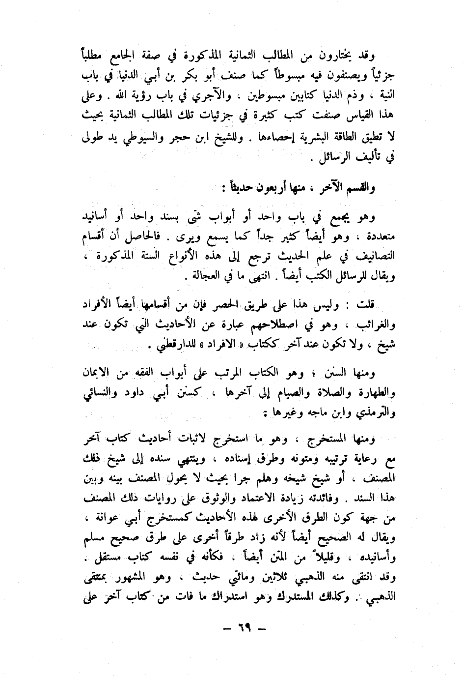 وَهُوَ يجمع فِي بَاب وَاحِد أَو أَبْوَاب شَتَّى بِسَنَد وَاحِد أَو أَسَانِيد مُتعَدِّدَة وَهُوَ أَيْضا كثير جدا كَمَا يسمع وَيرى فَالْحَاصِل أَن أَقسَام التصانيف فِي علم الحَدِيث ترجع إِلَى هَذِه الْأَنْوَاع السِّتَّة الْمَذْكُورَة وَيُقَال للرسائل الْكتب أَيْضا انْتهى مَا فِي العجالة