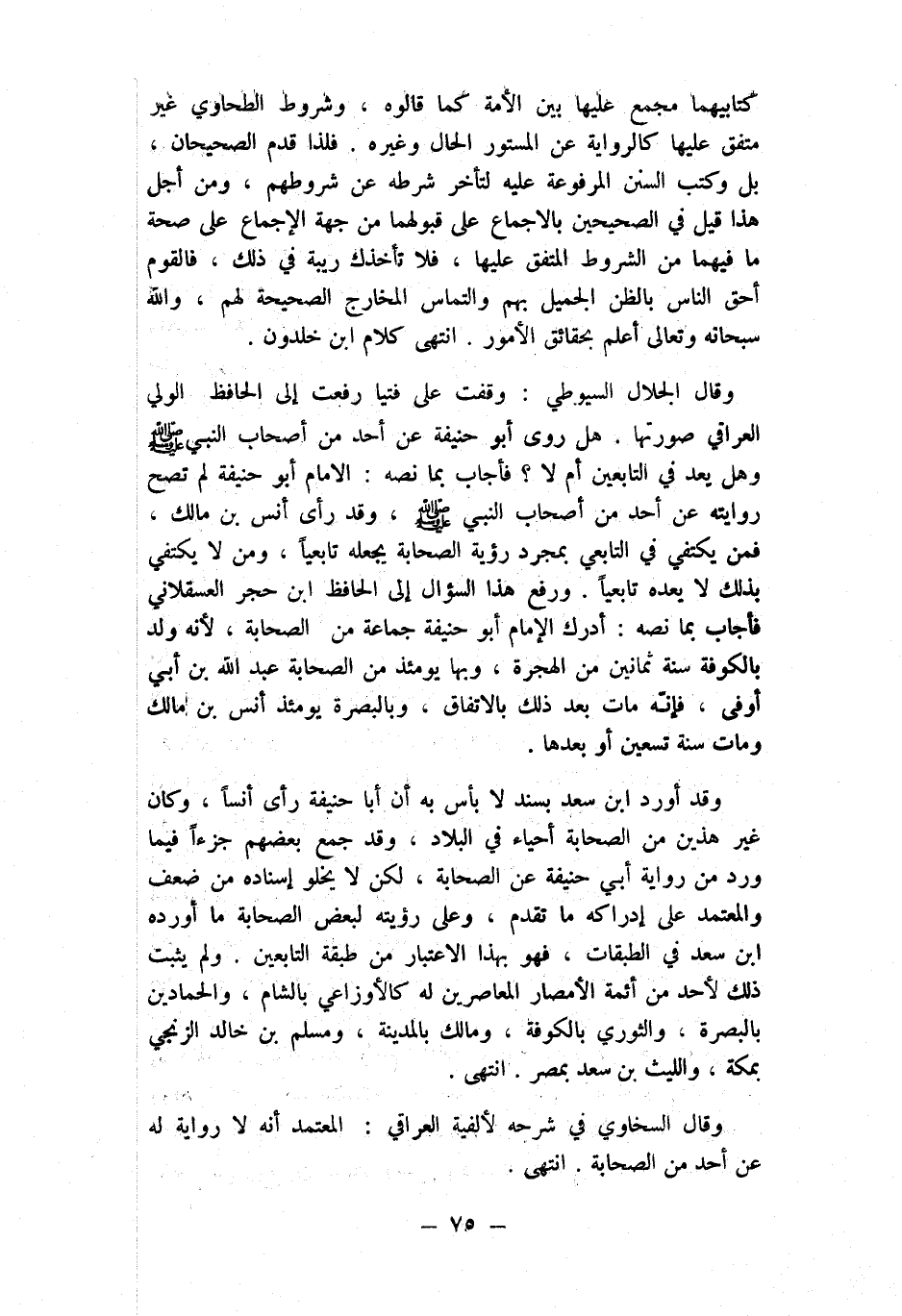 وَقَالَ الْجلَال السُّيُوطِيّ وقفت على فتيا رفعت إِلَى الْحَافِظ الْوَلِيّ الْعِرَاقِيّ صورتهَا هَل روى أَبُو حنيفَة عَن أحد من أَصْحَاب النَّبِي صلى الله عَلَيْهِ وَسلم وَهل يعد فِي التَّابِعين أم لَا فَأجَاب بِمَا نَصه الإِمَام أَبُو حنيفَة لم تصح رِوَايَته عَن أحد من أَصْحَاب النَّبِي صلى الله عَلَيْهِ وَسلم وَقد رأى أنس بن مَالك فَمن يَكْتَفِي فِي التَّابِعِيّ بِمُجَرَّد رُؤْيَة الصَّحَابَة يَجعله تابعيا وَمن لَا يَكْتَفِي بذلك لَا يعده تابعيا وَرفع هَذَا السُّؤَال إِلَى الْحَافِظ ابْن حجر الْعَسْقَلَانِي فَأجَاب بِمَا نَصه أدْرك الإِمَام أَبُو حنيفَة جمَاعَة من الصَّحَابَة لِأَنَّهُ ولد بِالْكُوفَةِ سنة ثَمَانِينَ من الْهِجْرَة وَبهَا يَوْمئِذٍ من الصَّحَابَة عبد الله بن أبي أوفى فَإِنَّهُ مَاتَ بعد ذَلِك بالِاتِّفَاقِ وبالبصرة يَوْمئِذٍ أنس بن مَالك وَمَات سنة تسعين أَو بعْدهَا
