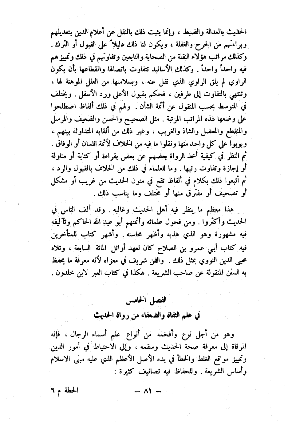 هَذَا مُعظم مَا ينظر فِيهِ أهل الحَدِيث وغالبه وَقد ألف النَّاس فِي الحَدِيث وَأَكْثرُوا وَمن فحول علمائه وأئمتهم أَبُو عبد الله الْحَاكِم وتآليفه فِيهِ مَشْهُورَة وَهُوَ الَّذِي هذبه وَأظْهر محاسنه وَأشهر كتاب للمتأخرين فِيهِ كتاب أبي عَمْرو بن الصّلاح كَانَ لعهد أَوَائِل الْمِائَة السَّابِعَة وتلاه محيى الدّين النَّوَوِيّ بِمثل ذَلِك والفن شرِيف فِي معزاه لِأَنَّهُ معرفَة مَا يحفظ بِهِ السّنَن المنقولة عَن صَاحب الشَّرِيعَة هَكَذَا فِي كتاب العبر لِابْنِ خلدون