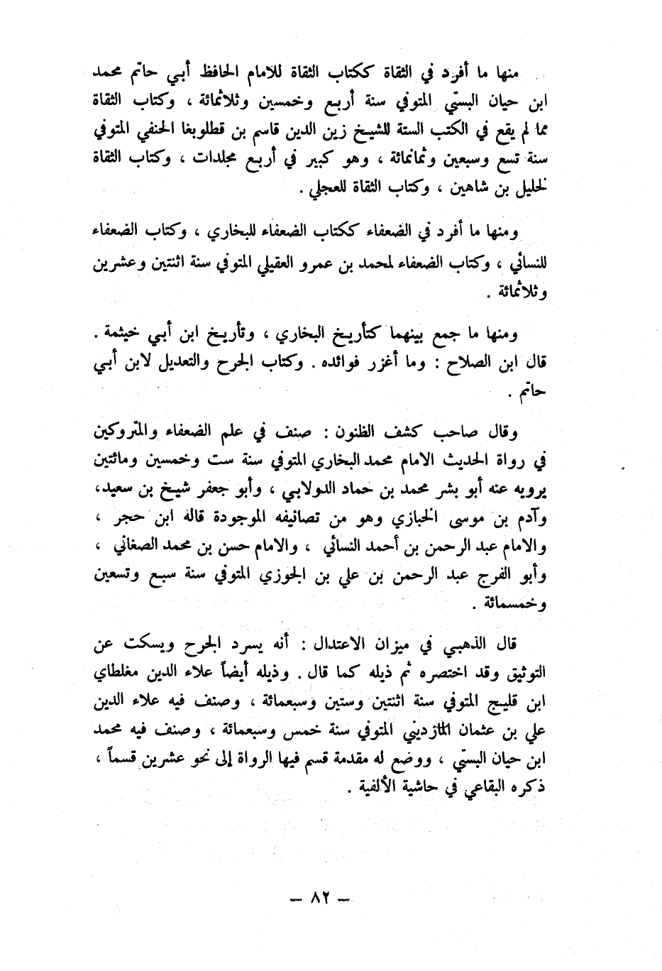 مِنْهَا مَا أفرد فِي الثقاة ككتاب الثقاة للْإِمَام الْحَافِظ أبي حَاتِم مُحَمَّد ابْن حَيَّان البستي المتوفي سنة أَربع وَخمسين وثلاثمائة وَكتاب الثقاة مِمَّا لم يَقع فِي الْكتب السِّتَّة للشَّيْخ زين الدّين قَاسم بن قطلوبغا الْحَنَفِيّ المتوفي سنة تسع وَسبعين وَثَمَانمِائَة وَهُوَ كَبِير فِي أَربع مجلدات وَكتاب الثقاة لخليل بن شاهين وَكتاب الثقاة للعجلي