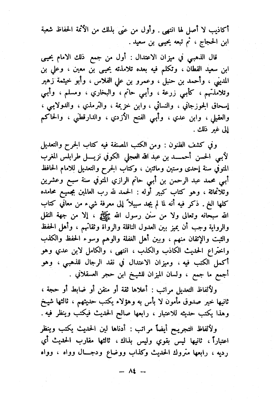 وَفِي كشف الظنون وَمن الْكتب المصنفة فِيهِ كتاب الْجرْح وَالتَّعْدِيل لأبي الْحسن أَحْمد بن عبد الله الْعجلِيّ الْكُوفِي نزيل طرابلس الْمغرب المتوفي سنة إِحْدَى وَسِتِّينَ وَمِائَتَيْنِ وَكتاب الْجرْح وَالتَّعْدِيل للْإِمَام الْحَافِظ أبي مُحَمَّد عبد الرَّحْمَن بن أبي حَاتِم الرَّازِيّ المتوفي سنة سبع وَعشْرين وثلاثمائة وَهُوَ كتاب كَبِير أَوله الْحَمد لله رب الْعَالمين بِجَمِيعِ محامده كلهَا الخ ذكر فِيهِ أَنه لم يجد سَبِيلا إِلَى معرفَة شَيْء من مَعَاني كتاب الله سُبْحَانَهُ وَتَعَالَى وَلَا من سنَن رَسُول الله صلى الله عَلَيْهِ وَسلم إِلَّا من جِهَة النَّقْل وَالرِّوَايَة وَجب أَن يُمَيّز بَين الْعُدُول الناقلة والرواة وثقاتهم وَأهل الْحِفْظ والثبت والإتقان مِنْهُم وَبَين أهل الْغَفْلَة وَالوهم وَسُوء الْحِفْظ وَالْكذب واختراع الحَدِيث الْكَاذِب وَالْكذب انْتهى والكامل لِابْنِ عدي وَهُوَ أكمل الْكتب فِيهِ وميزان الِاعْتِدَال فِي نقد الرِّجَال للذهبي وَهُوَ أجمع مَا جمع ولسان الْمِيزَان للشَّيْخ ابْن حجر الْعَسْقَلَانِي