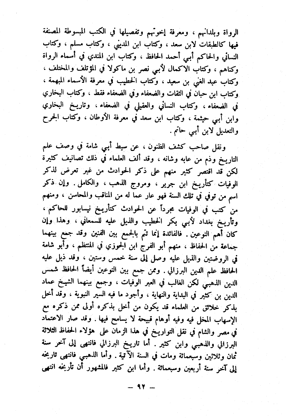 وَنقل صَاحب كشف الظنون عَن سبط أبي شامة فِي وصف علم التَّارِيخ وذم من عابه وشانه وَقد ألف الْعلمَاء فِي ذَلِك تصانيف كَثِيرَة لَكِن قد اقْتصر كثيرمنهم على ذكر الْحَوَادِث من غير تعرض لذكر الوفيات كتأريخ ابْن جرير ومروج الذَّهَب والكامل وَإِن ذكر اسْم من توفّي فِي تِلْكَ السّنة فَهُوَ عَار عَمَّا لَهُ من المناقب والمحاسن وَمِنْهُم من كتب فِي الوفيات مُجَردا عَن الْحَوَادِث كتأريخ نيسابور للْحَاكِم وتأريخ بَغْدَاد لأبي بكر الْخَطِيب والذيل عَلَيْهِ للسمعاني وَهَذَا وَإِن كَانَ أهم النَّوْعَيْنِ فالفائدة إِنَّمَا تتمّ بِالْجمعِ بَين الفنين وَقد جمع بَينهمَا جمَاعَة من الْحفاظ مِنْهُم أَبُو الْفرج ابْن الْجَوْزِيّ فِي المنتظم وَأَبُو شامة فِي الروضتين والذيل عَلَيْهِ وصل إِلَى سنة خمس وَسِتِّينَ وَقد ذيل عَلَيْهِ الْحَافِظ علم الدّين البرزالي وَمِمَّنْ جمع بَين النَّوْعَيْنِ أَيْضا الْحَافِظ شمس الدّين الذَّهَبِيّ لَكِن الْغَالِب فِي العبر الوفيات وَجمع بَينهمَا الشَّيْخ عماد الدّين بن كثير فِي الْبِدَايَة وَالنِّهَايَة وأجود مَا فِيهِ السّير النَّبَوِيَّة وَقد أخل بِذكر خلائق من الْعلمَاء قد يكون من أخل بِذكرِهِ أولى مِمَّن ذكره مَعَ الإسهاب المخل فِيهِ وَفِيه أَوْهَام قبيحة لَا يسامح فِيهَا وَقد صَار الِاعْتِمَاد فِي مصر وَالشَّام فِي نقل التواريخ فِي هَذَا الزَّمَان على هَؤُلَاءِ الْحفاظ الثَّلَاثَة البرزالي والذهبي وَابْن كثير أما تَارِيخ البرزالي فَانْتهى إِلَى آخر سنة ثَمَان وَثَلَاثِينَ وَسَبْعمائة وَمَات فِي السّنة الْآتِيَة وَأما الذَّهَبِيّ فَانْتهى تَارِيخه إِلَى آخر سنة أَرْبَعِينَ وَسَبْعمائة وَأما ابْن كثير فَالْمَشْهُور أَن تأريخه انْتهى