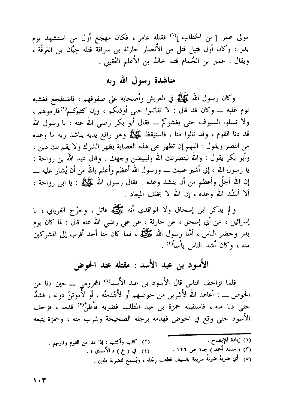 فلما تزاحف الناس قال الأسود بن عبد الأسد [ (4) ] المخزومي- حين دنا من الحوض-: أعاهد اللَّه لأشربن من حوضهم أو لأهدمنّه، أو لأموتنّ دونه، فشدّ حتى دنا منه، فاستقبله حمزة بن عبد المطلب فضربه فأطنّ [ (5) ] قدمه، فزحف الأسود حتى وقع في الحوض فهدمه برجله الصحيحة وشرب منه، وحمزة يتبعه