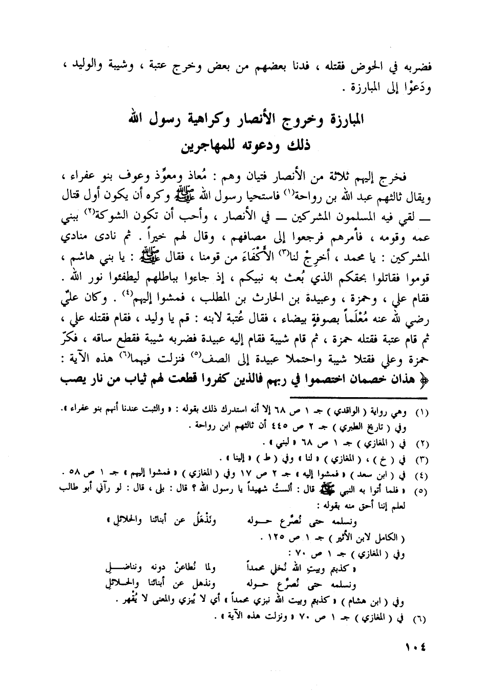 المبارزة وخروج الأنصار وكراهية رسول اللَّه ذلك ودعوته للمهاجرين