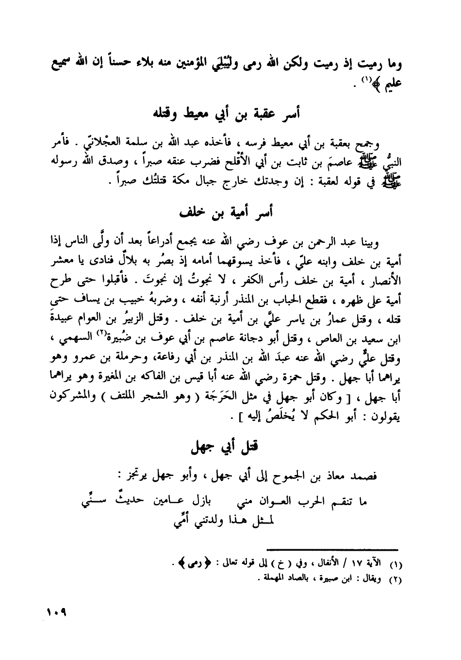 وبينا عبد الرحمن بن عوف رضي اللَّه عنه يجمع أدراعا بعد أن ولّى الناس إذا أمية بن خلف وابنه عليّ، فأخذ يسوقهما أمامه إذ بصر به بلال فنادى يا معشر الأنصار، أمية بن خلف رأس الكفر، لا نجوت إن نجوت. فأقبلوا حتى طرح أمية على ظهره، فقطع الحباب بن المنذر أرنبة أنفه، وضربه خبيب بن يساف حتى قتله، وقتل عمار بن ياسر عليّ بن أمية بن خلف. وقتل الزبير بن العوام عبيدة ابن سعيد بن العاص، وقتل أبو دجانة عاصم بن أبي عوف بن ضبيرة [ (2) ] السهمي، وقتل عليّ رضي اللَّه عنه عبد اللَّه بن المنذر بن أبي رفاعة، وحرملة بن عمرو وهو يراهما أبا جهل. وقتل حمزة رضي اللَّه عنه أبا قيس بن الفاكه بن المغيرة وهو يراهما أبا جهل، [وكان أبو جهل في مثل الحرجة (وهو الشجر الملتف) والمشركون يقولون: أبو الحكم لا يخلص إليه] .