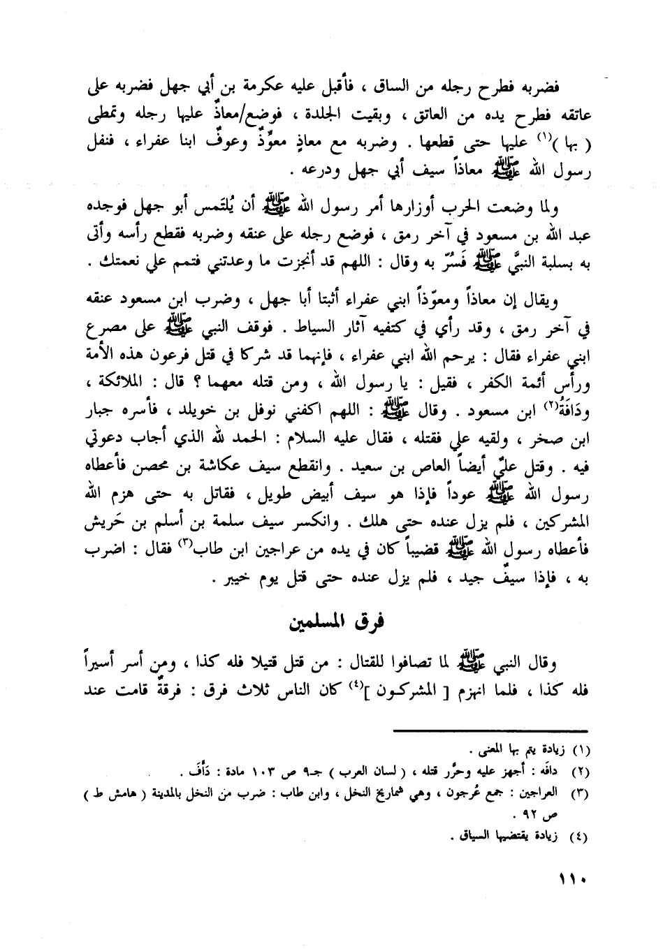 فوقف النبي صلّى اللَّه عليه وسلّم على مصرع ابني عفراء فقال: يرحم اللَّه ابني عفراء، فإنّهما قد شركا في قتل فرعون هذه الأمة ورأس أئمة الكفر، فقيل: يا رسول اللَّه، ومن قتله معهما؟ قال: الملائكة، ودافة [ (2) ] ابن مسعود.
