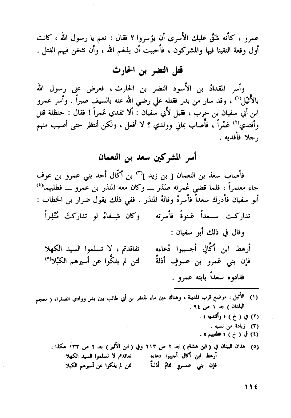 [ (5) ] هذان البيتان في (ابن هشام) ج 2 ص 213 وفي (ابن الأثير) ج 2 ص 133 هكذا: