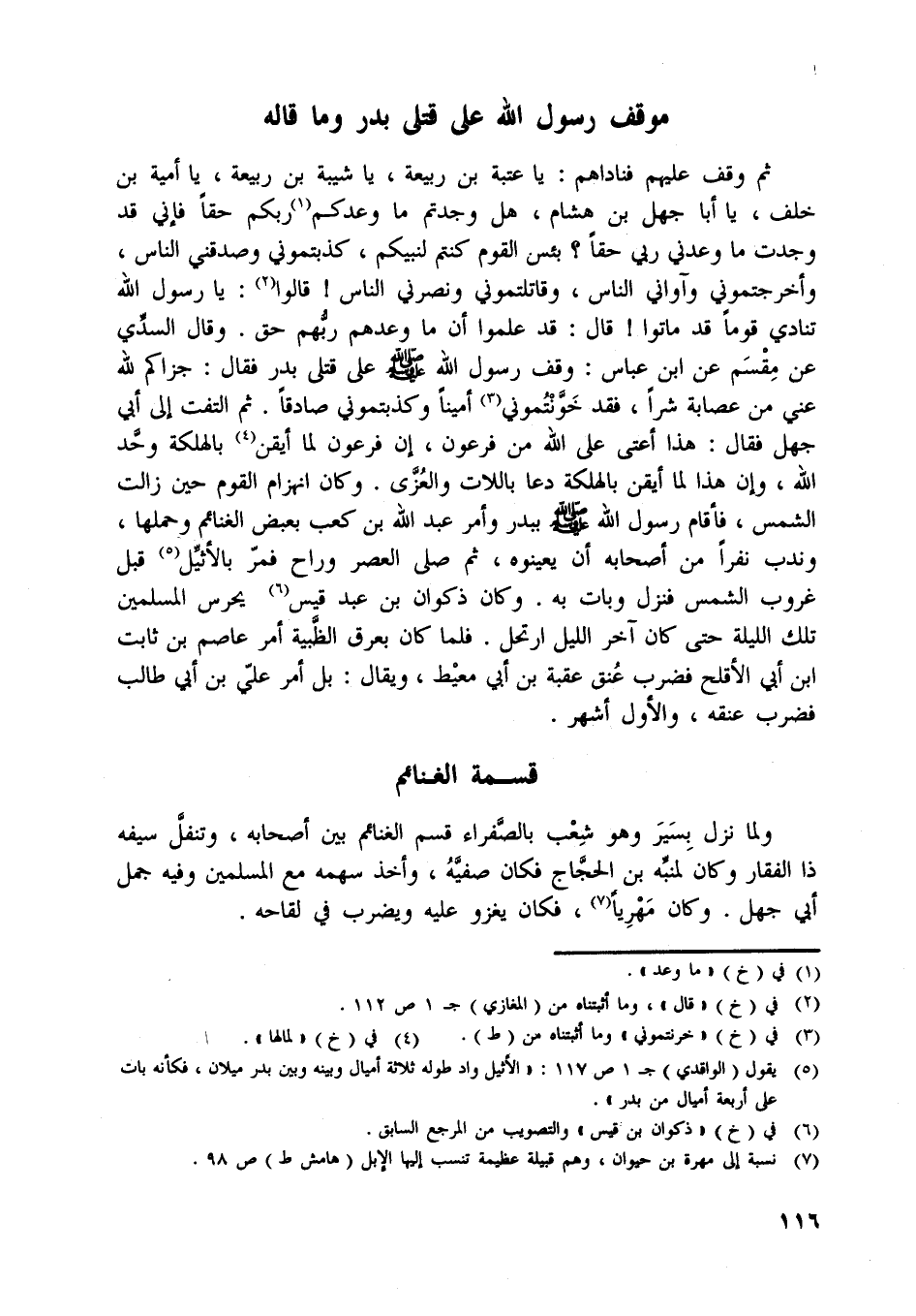 وقف عليهم فناداهم: يا عتبة بن ربيعة، يا شيبة بن ربيعة، يا أمية بن خلف، يا أبا جهل بن هشام، هل وجدتم ما وعدكم [ (1) ] ربكم حقا فإنّي قد وجدت ما وعدني ربي حقا؟ بئس القوم كنتم لنبيكم، كذبتموني وصدقني الناس، وأخرجتموني وآواني الناس، وقاتلتموني ونصرني الناس! قالوا [ (2) ] : يا رسول اللَّه تنادي قوما قد ماتوا! قال: قد علموا أن ما وعدهم ربّهم حق.
