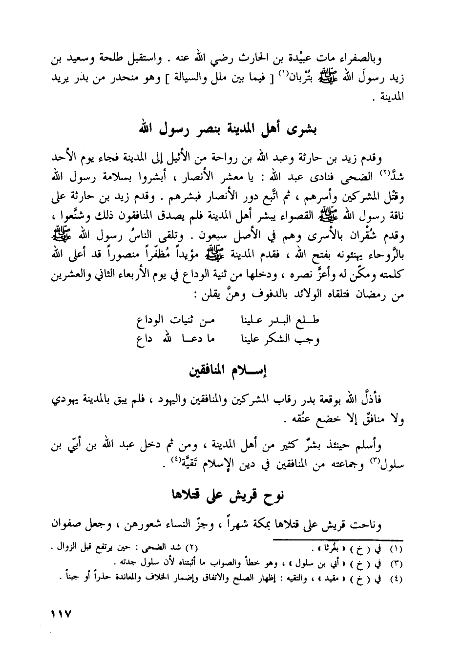 وقدم زيد بن حارثة وعبد اللَّه بن رواحة من الأثيل إلى المدينة فجاء يوم الأحد شدّ [ (2) ] الضحى فنادى عبد اللَّه: يا معشر الأنصار، أبشروا بسلامة رسول اللَّه وقتل المشركين وأسرهم، ثم اتّبع دور الأنصار فبشرهم. وقدم زيد بن حارثة على ناقة رسول اللَّه صلّى اللَّه عليه وسلّم القصواء يبشر أهل المدينة فلم يصدق المنافقون ذلك وشنّعوا، وقدم شقران بالأسرى وهم في الأصل سبعون. وتلقى الناس رسول اللَّه صلّى اللَّه عليه وسلّم بالرّوحاء يهنئونه بفتح اللَّه، فقدم المدينة صلّى اللَّه عليه وسلّم مؤيدا مظفّرا منصورا قد أعلى اللَّه كلمته ومكّن له وأعزّ نصره، ودخلها من ثنية الوداع في يوم الأربعاء الثاني والعشرين من رمضان فتلقاه الولائد بالدفوف وهنّ يقلن:
