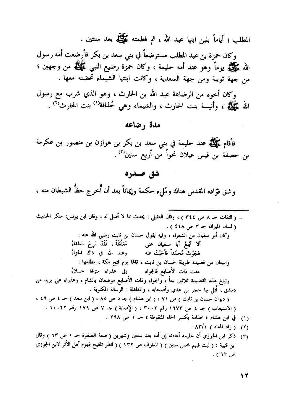 [ (3) ] ذكر ابن الجوزي أن حليمة أعادته إلى أمه بعد سنتين وشهرين (صفة الصفوة ج 1 ص 63) وقال ابن قتيبة: (لبث فيهم خمس سنين) (المعارف ص 132) (انظر تلقيح فهوم أهل الأثر لابن الجوزي ص 13) .