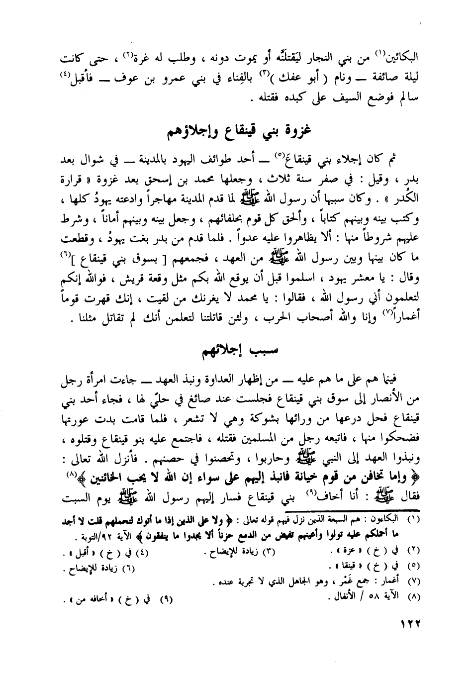 ثم كان إجلاء بني قينقاع [ (5) ]- أحد طوائف اليهود بالمدينة- في شوال بعد بدر، وقيل: في صفر سنة ثلاث، وجعلها محمد بن إسحاق بعد غزوة «قرارة الكدر» . وكان سببها أن رسول اللَّه صلّى اللَّه عليه وسلّم لما قدم المدينة مهاجرا وادعته يهود كلها، وكتب بينه وبينهم كتابا، وألحق كل قوم بحلفائهم، وجعل بينه وبينهم أمانا، وشرط عليهم شروطا منها: ألا يظاهروا عليه عدوا.