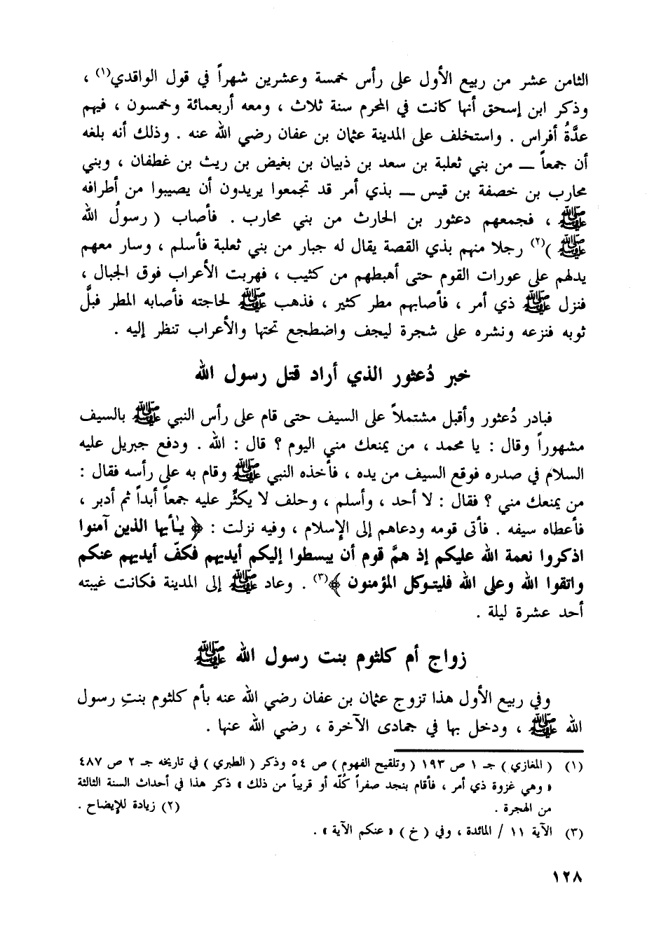 وفي ربيع الأول هذا تزوج عثمان بن عفان رضي اللَّه عنه بأم كلثوم بنت رسول اللَّه صلّى اللَّه عليه وسلّم، ودخل بها في جمادى الآخرة، رضي اللَّه عنها.