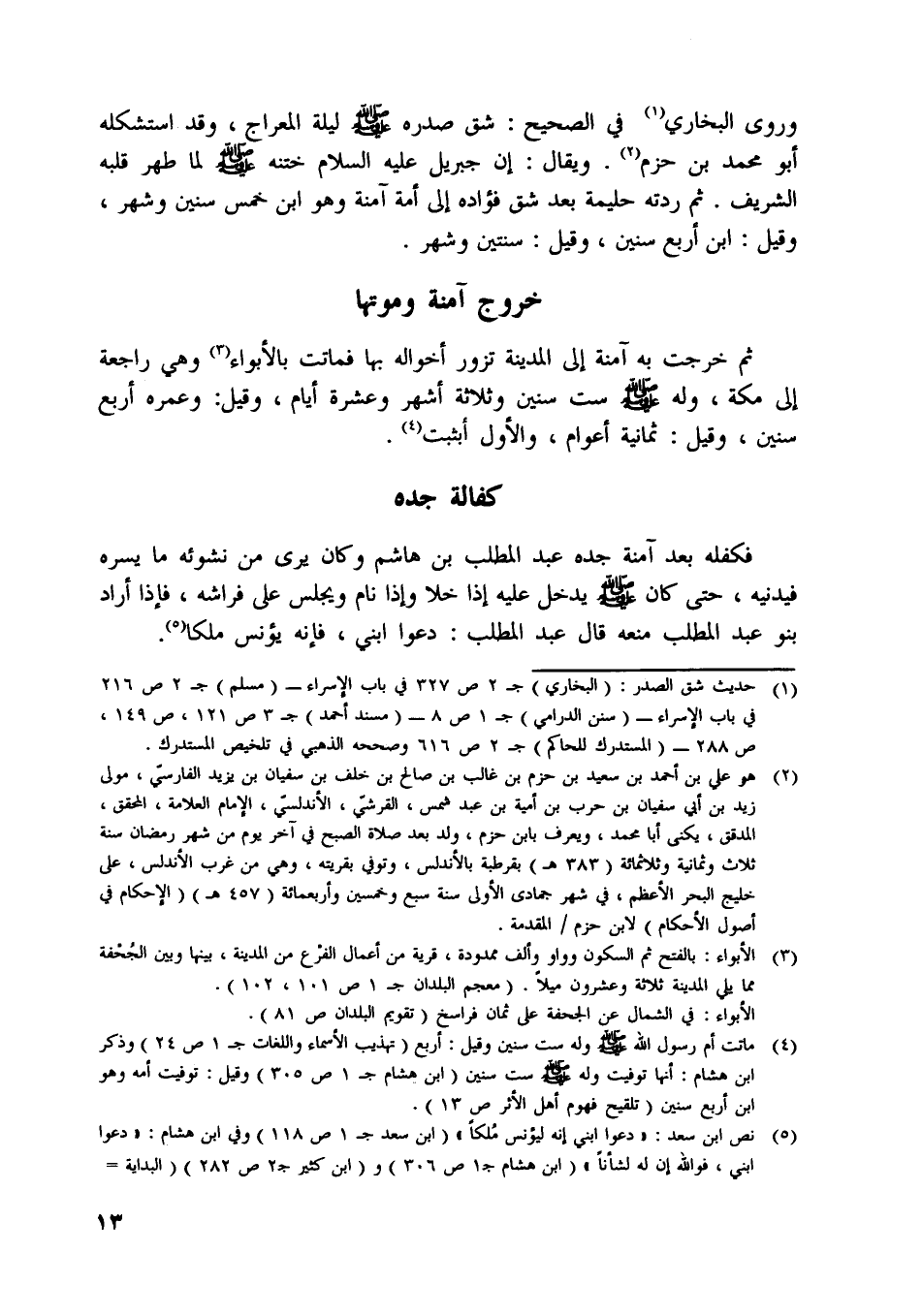 [ (5) ] نص ابن سعد: «دعوا ابني إنه ليؤنس ملكا» (ابن سعد ج 1 ص 118) وفي ابن هشام: «دعوا ابني، فو اللَّه إن له لشأنا» (ابن هشام ج 1 ص 306) و (ابن كثير ج 2 ص 282) (البداية