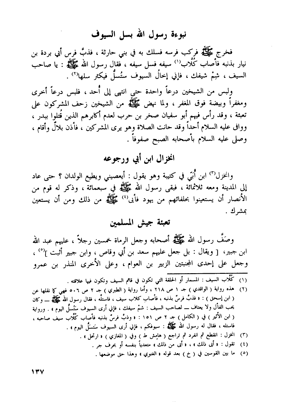 [ (2) ] هذه رواية (الواقدي) ج 1 ص 218، وأما رواية (الطبري) ج 2 ص 506 فهي كما نقلها عن (ابن إسحاق) : «فذبّ فرس بذنبه، فأصاب كلاب سيف، فاستلّه،