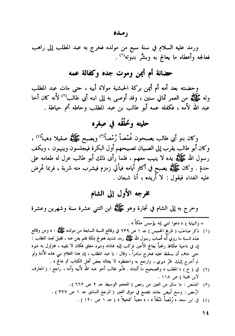 [ (1) ] ذكر صاحب (تاريخ الخميس) ج 1 ص 239 في وقائع السنة السابعة من مولده صلّى اللَّه عليه وسلّم: «ومن وقائع هذه السنة ما روي أنه أصاب رسول اللَّه صلّى اللَّه عليه وسلّم رمد شديد فعولج بمكة فلم يغن عنه، فقيل لعبد المطلب: