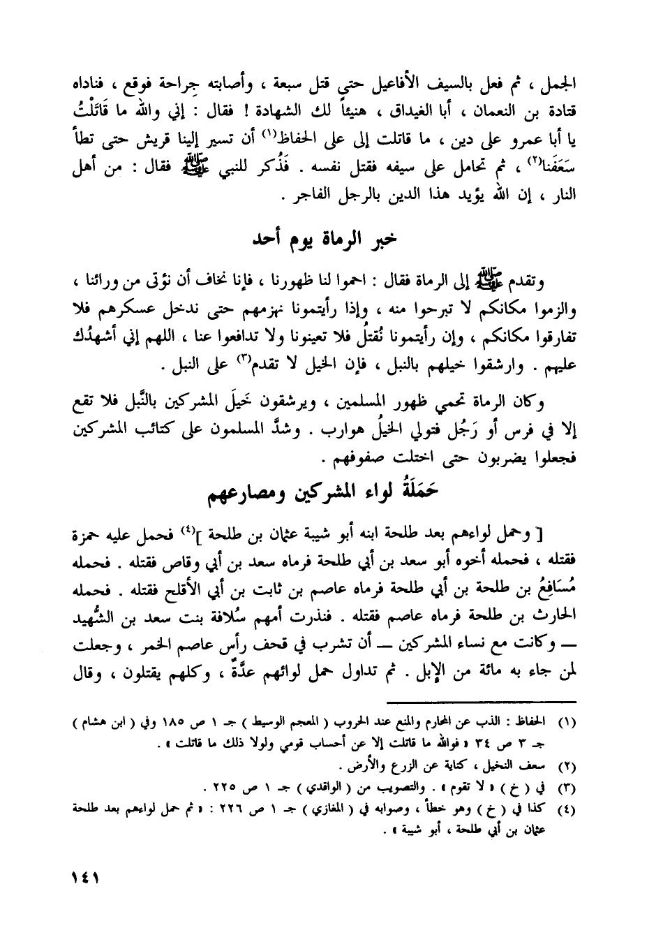 [ (4) ] كذا في (خ) وهو خطأ، وصوابه في (المغازي) ج 1 ص 226: «ثم حمل لواءهم بعد طلحة عثمان بن أبي طلحة، أبو شيبة» .