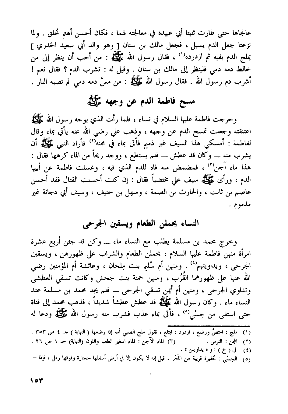 وخرج محمد بن مسلمة يطلب مع النساء ماء- وكن قد جئن أربع عشرة امرأة منهن فاطمة عليها السلام، يحملن الطعام والشراب على ظهورهن، ويسقين الجرحى، ويداوينهم [ (4) ] . ومنهن أم سليم بنت ملحان، وعائشة أم المؤمنين رضي اللَّه عنها على ظهورهما القرب، ومنهن حمنة بنت جحش وكانت تسقي العطشى وتداوي الجرحى، ومنهن أم أيمن تسقي الجرحى- فلم يجد محمد بن مسلمة عند النساء ماء. وكان رسول اللَّه صلّى اللَّه عليه وسلّم قد عطش عطشا شديدا، فذهب محمد إلى قناة حتى استفى من حسي [ (5) ] ، فأتى بماء عذب فشرب منه رسول اللَّه صلّى اللَّه عليه وسلّم ودعا له