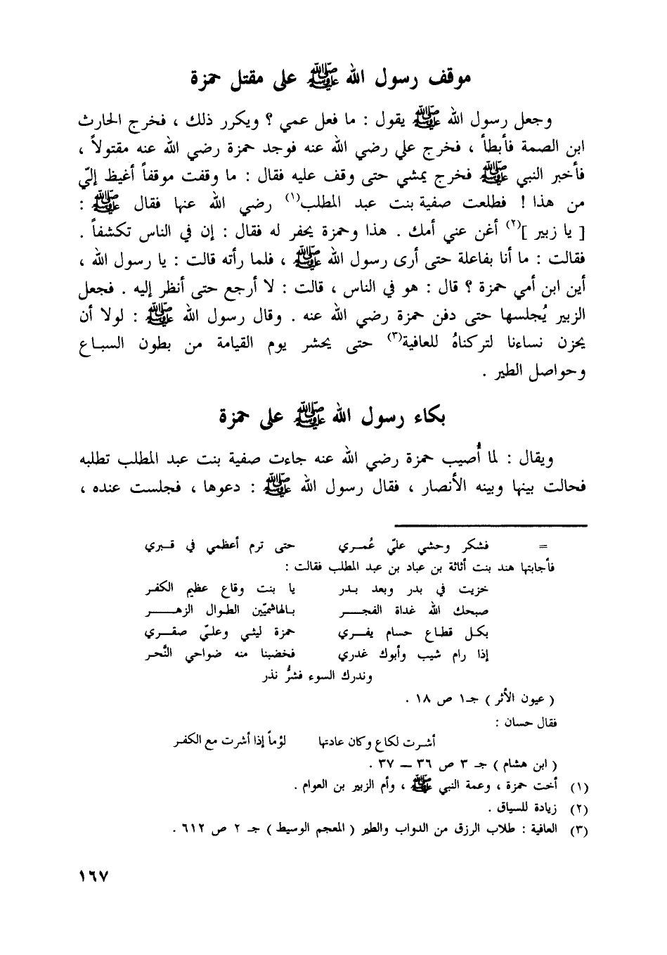 ويقال: لما أصيب حمزة رضي اللَّه عنه جاءت صفية بنت عبد المطلب تطلبه فحالت بينها وبينه الأنصار، فقال رسول اللَّه صلّى اللَّه عليه وسلّم: دعوها، فجلست عنده،