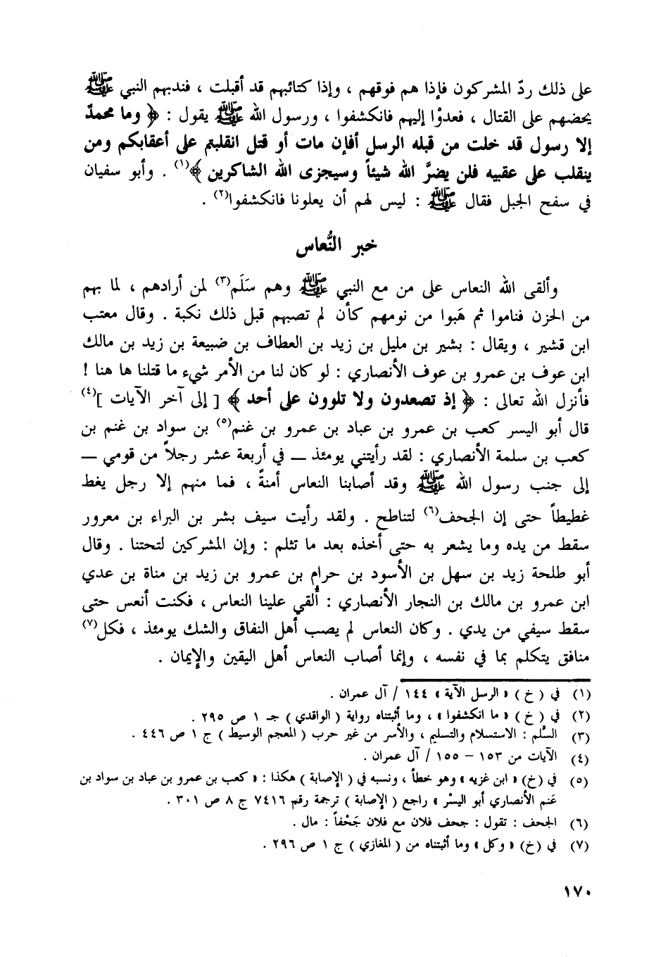 فندبهم النبي صلّى اللَّه عليه وسلّم يحضهم على القتال، فعدوا إليهم فانكشفوا، ورسول اللَّه صلّى اللَّه عليه وسلّم يقول: وَما مُحَمَّدٌ إِلَّا رَسُولٌ قَدْ خَلَتْ مِنْ قَبْلِهِ الرُّسُلُ أَفَإِنْ ماتَ أَوْ قُتِلَ انْقَلَبْتُمْ عَلى أَعْقابِكُمْ وَمَنْ يَنْقَلِبْ عَلى عَقِبَيْهِ فَلَنْ يَضُرَّ اللَّهَ شَيْئاً وَسَيَجْزِي اللَّهُ الشَّاكِرِينَ [ (1) ] .