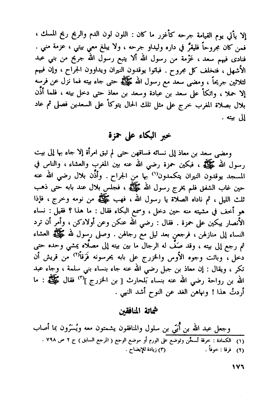 ومضى سعد بن معاذ إلى نسائه فساقهن حتى لم تبق امرأة إلا جاء بها إلى بيت رسول اللَّه صلّى اللَّه عليه وسلّم، فبكين حمزة رضي اللَّه عنه بين المغرب والعشاء، والناس في المسجد يوقدون النيران يتكمدون [ (1) ] بها من الجراح. وأذّن بلال رضي اللَّه عنه حين غاب الشفق فلم يخرج رسول اللَّه صلّى اللَّه عليه وسلّم، فجلس بلال عند بابه حتى ذهب ثلث الليل، ثم ناداه الصلاة يا رسول اللَّه،