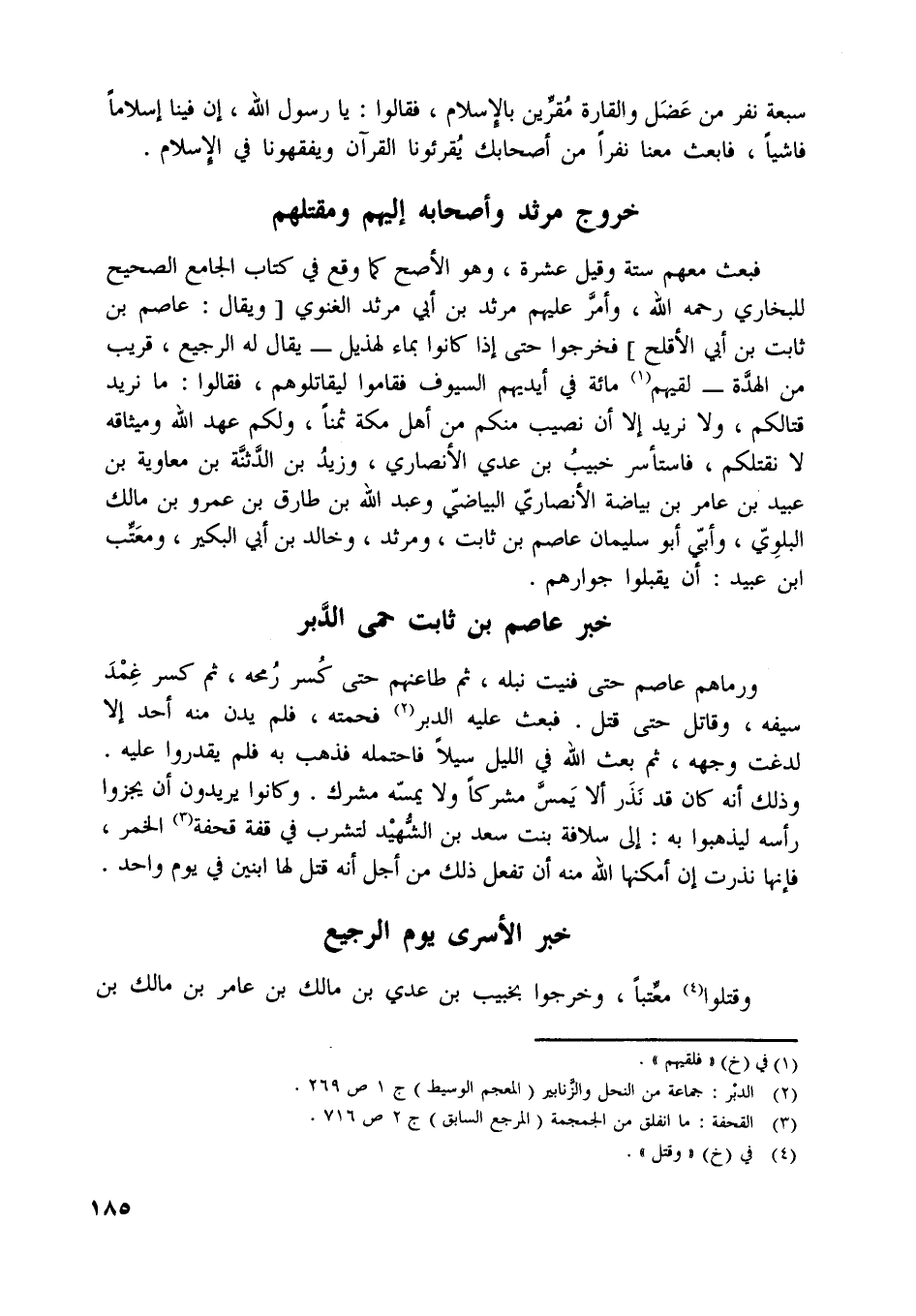 سبعة نفر من عضل والقارة مقرّين بالإسلام، فقالوا: يا رسول اللَّه، إن فينا إسلاما فاشيا، فابعث معنا نفرا من أصحابك يقرئونا القرآن ويفقهونا في الإسلام.