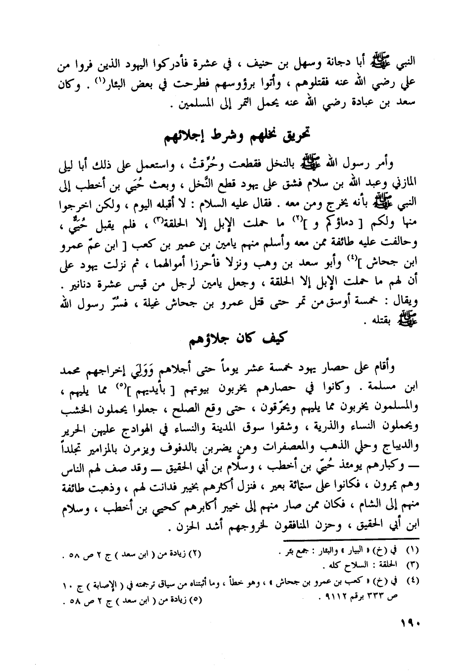 فلم يقبل حييّ، وحالفت عليه طائفة ممن معه وأسلّم منهم يامين بن عمير بن كعب [ابن عمّ عمرو ابن جحاش] [ (4) ] وأبو سعد بن وهب ونزلا فأحرزا أموالهما، ثم نزلت يهود على أن لهم ما حملت الإبل إلا الحلقة، وجعل يامين لرجل من قيس عشرة دنانير.