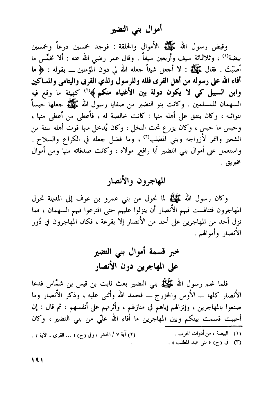فقال صلّى اللَّه عليه وسلّم: لا أجعل شيئا جعله اللَّه لي دون المؤمنين- بقوله: ما أَفاءَ اللَّهُ عَلى رَسُولِهِ مِنْ أَهْلِ الْقُرى فَلِلَّهِ وَلِلرَّسُولِ وَلِذِي الْقُرْبى وَالْيَتامى وَالْمَساكِينِ وَابْنِ السَّبِيلِ كَيْ لا يَكُونَ دُولَةً بَيْنَ الْأَغْنِياءِ مِنْكُمْ [ (2) ] كهيئة ما وقع فيه السهمان للمسلمين.