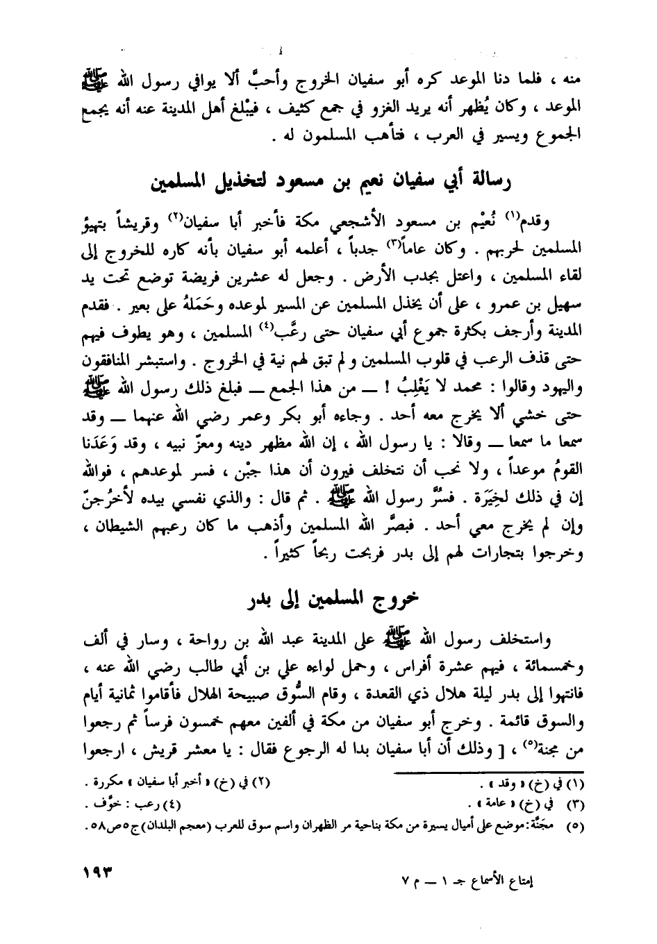 وقدم [ (1) ] نعيم بن مسعود الأشجعي مكة فأخبر أبا سفيان [ (2) ] وقريشا بتهيؤ المسلمين لحربهم. وكان عاما [ (3) ] جدبا، أعلمه أبو سفيان بأنه كاره للخروج إلى لقاء المسلمين، واعتل بجدب الأرض. وجعل له عشرين فريضة توضع تحت يد سهيل بن عمرو، على أن يخذل المسلمين عن المسير لموعده وحمله على بعير. فقدم المدينة وأرجف بكثرة جموع أبي سفيان حتى رعّب [ (4) ] المسلمين، وهو يطوف فيهم حتى قذف الرعب في قلوب المسلمين ولم تبق لهم نية في الخروج. واستبشر المنافقون واليهود وقالوا: محمد لا يغلب! - من هذا الجمع- فبلغ ذلك رسول اللَّه صلّى اللَّه عليه وسلّم حتى خشي ألا يخرج معه أحد. وجاءه أبو بكر وعمر رضي اللَّه عنهما- وقد سمعا ما سمعا- وقالا: يا رسول اللَّه، إن اللَّه مظهر دينه ومعزّ نبيه، وقد وعدنا القوم موعدا، ولا نحب أن نتخلف فيرون أن هذا جبن، فسر لموعدهم، فو اللَّه إن في ذلك لخيرة.