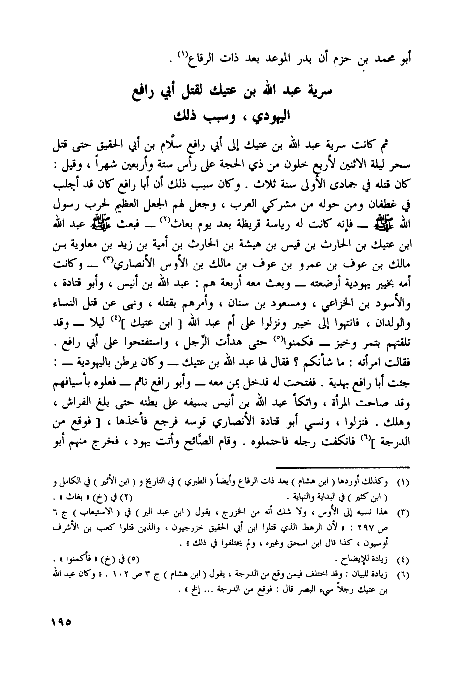 [ (3) ] هذا نسبه إلى الأوس، ولا شك أنه من الخزرج، يقول (ابن عبد البر) في (الاستيعاب) ج 6 ص 297: «لأن الرهط الّذي قتلوا ابن أبي الحقيق خزرجيون، والذين قتلوا كعب بن الأشرف أوسيون، كذا قال ابن إسحاق وغيره، ولم يختلفوا في ذلك» .