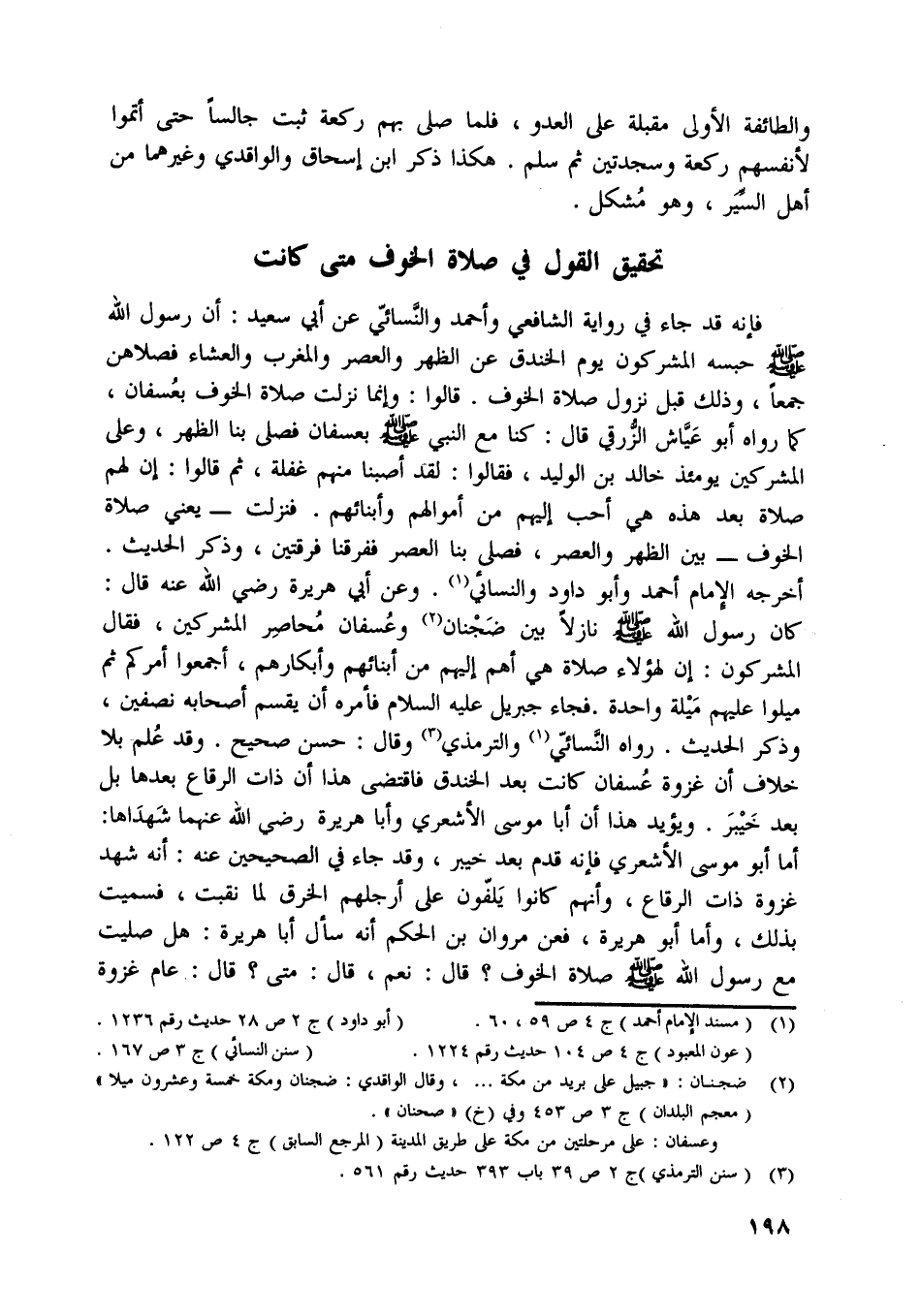 والطائفة الأولى مقبلة على العدو، فلما صلى بهم ركعة ثبت جالسا حتى أتموا لأنفسهم ركعة وسجدتين ثم سلّم. هكذا ذكر ابن إسحاق والواقدي وغيرهما من أهل السّير، وهو مشكل.