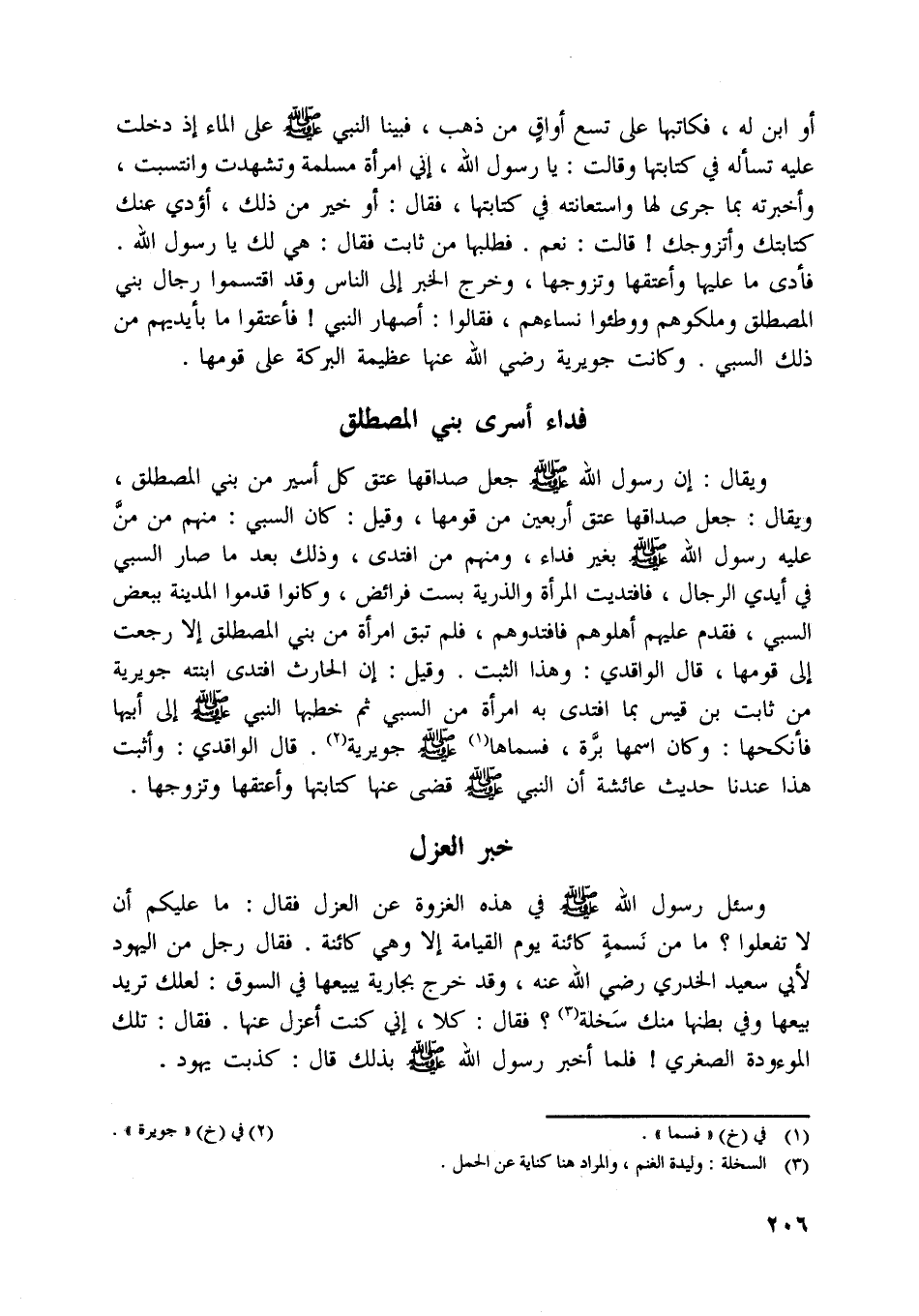 ويقال: إن رسول اللَّه صلّى اللَّه عليه وسلّم جعل صداقها عتق كل أسير من بني المصطلق، ويقال: جعل صداقها عتق أربعين من قومها، وقيل: كان السبي: منهم من منّ عليه رسول اللَّه صلّى اللَّه عليه وسلّم بغير فداء، ومنهم من افتدى، وذلك بعد ما صار السبي في أيدي الرجال، فافتديت المرأة والذرية بست فرائض، وكانوا قدموا المدينة ببعض السبي، فقدم عليهم أهلوهم فافتدوهم، فلم تبق امرأة من بني المصطلق إلا رجعت إلى قومها، قال الواقدي: وهذا الثبت. وقيل: إن الحارث افتدى ابنته جويرية من ثابت بن قيس بما افتدى به امرأة من السبي ثم خطبها النبي صلّى اللَّه عليه وسلّم إلى أبيها فأنكحها: وكان اسمها برّة، فسماها [ (1) ] صلّى اللَّه عليه وسلّم جويرية [ (2) ] . قال الواقدي: وأثبت هذا عندنا حديث عائشة أن النبي صلّى اللَّه عليه وسلّم قضى عنها كتابتها وأعتقها وتزوجها.