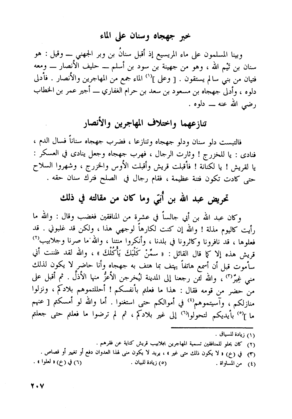 وكان عبد اللَّه بن أبيّ جالسا في عشرة من المنافقين فغضب وقال: واللَّه ما رأيت كاليوم مذلة! واللَّه إن كنت لكارها لوجهي هذا، ولكن قد غلبوني. قد فعلوها، قد نافرونا وكاثرونا في بلدنا، وأنكروا منتنا، واللَّه ما صرنا وجلابيب [ (2) ] قريش هذه إلا كما قال القائل: «سمّن كلبك يأكلك» ، واللَّه لقد ظننت أني سأموت قبل أن أسمع هاتفا يهتف بما هتف به جهجاه وأنا حاضر لا يكون لذلك مني غير [ (3) ] ، واللَّه لئن رجعنا إلى المدينة ليخرجن الأعزّ منها الأذلّ. ثم أقبل على من حضر من قومه فقال: هذا ما فعلتم بأنفسكم! أحللتموهم بلادكم، ونزلوا منازلكم، وآسيتموهم [ (4) ] في أموالكم حتى استغنوا. أما واللَّه لو أمسكتم [عنهم ما] [ (5) ] بأيديكم لتحولوا [ (6) ] إلى غير بلادكم، ثم لم ترضوا ما فعلتم حتى جعلتم