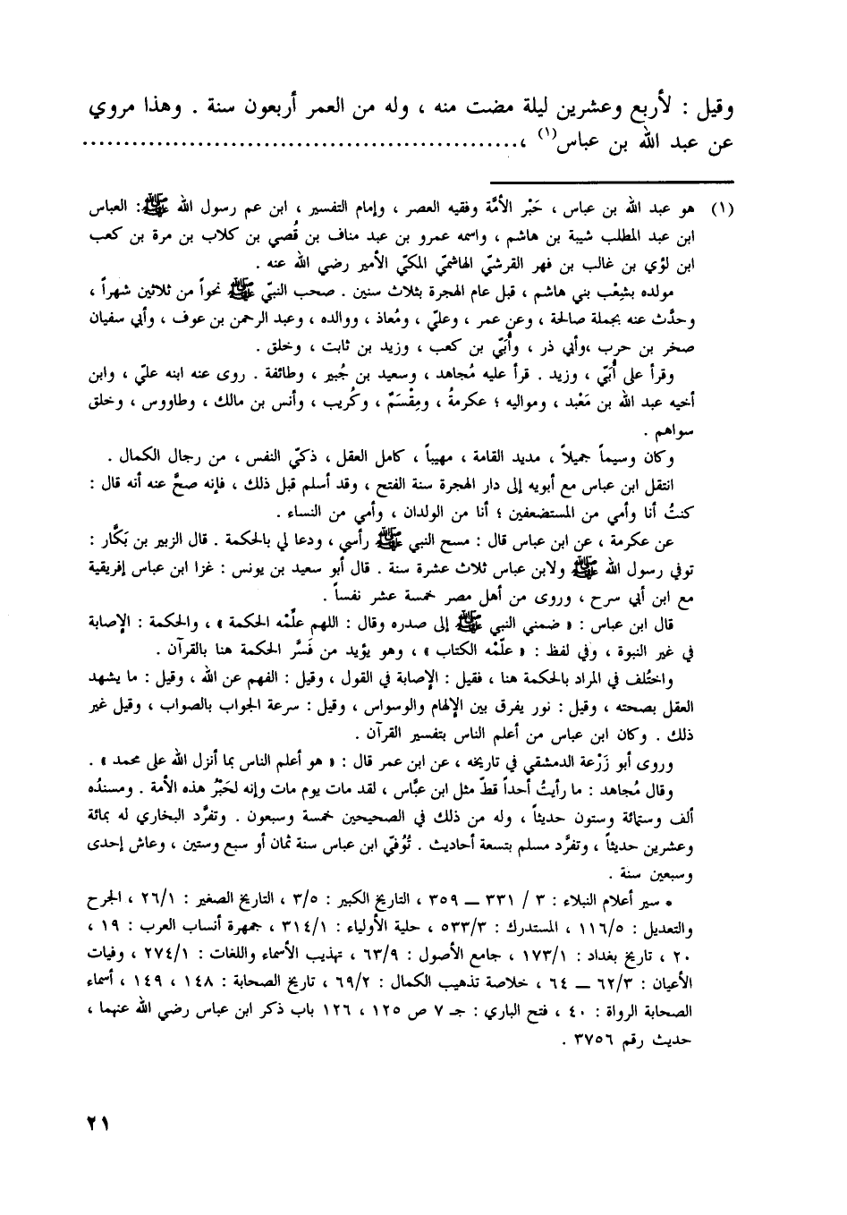 * سير أعلام النبلاء: 3/ 331- 359، التاريخ الكبير: 5/ 3، التاريخ الصغير: 1/ 26، الجرح والتعديل: 5/ 116، المستدرك: 3/ 533، حلية الأولياء: 1/ 314، جمهرة أنساب العرب: 19، 20، تاريخ بغداد: 1/ 173، جامع الأصول: 9/ 63، تهذيب الأسماء واللغات: 1/ 274، وفيات الأعيان: 3/ 62- 64، خلاصة تذهيب الكمال: 2/ 69، تاريخ الصحابة: 148، 149، أسماء الصحابة الرواة: 40، فتح الباري: ج 7 ص 125، 126 باب ذكر ابن عباس رضي اللَّه عنهما، حديث رقم 3756.