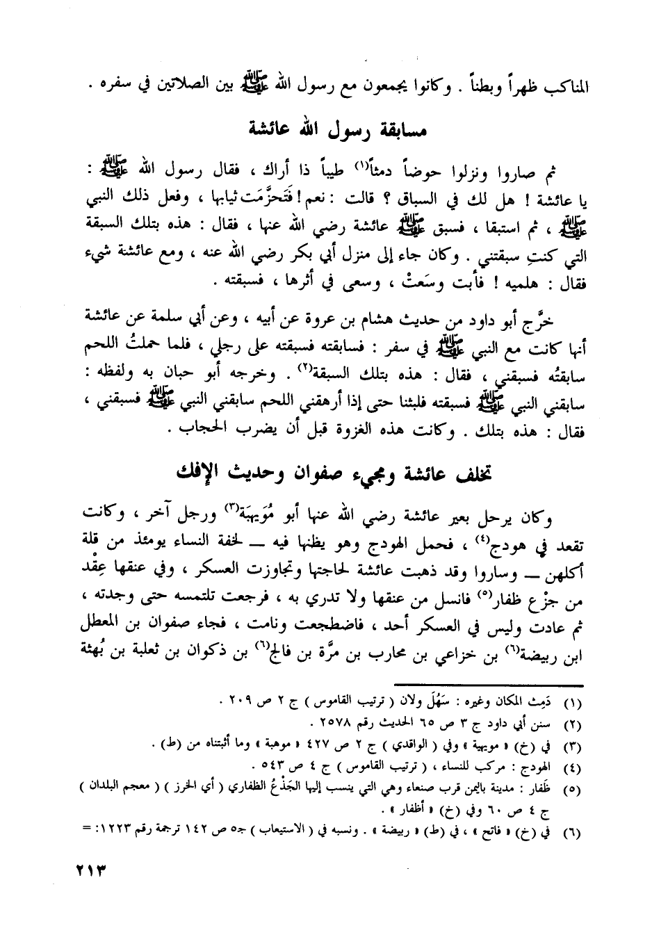 خرّج أبو داود من حديث هشام بن عروة عن أبيه، وعن أبي سلمة عن عائشة أنها كانت مع النبي صلّى اللَّه عليه وسلّم في سفر: فسابقته فسبقته على رجلي، فلما حملت اللحم سابقته فسبقني، فقال: هذه بتلك السبقة [ (2) ] . وخرجه أبو حبان به ولفظه: سابقني النبي صلّى اللَّه عليه وسلّم فسبقته فلبثنا حتى إذا أرهقني اللحم سابقني النبي صلّى اللَّه عليه وسلّم فسبقني، فقال: هذه بتلك. وكانت هذه الغزوة قبل أن يضرب الحجاب.