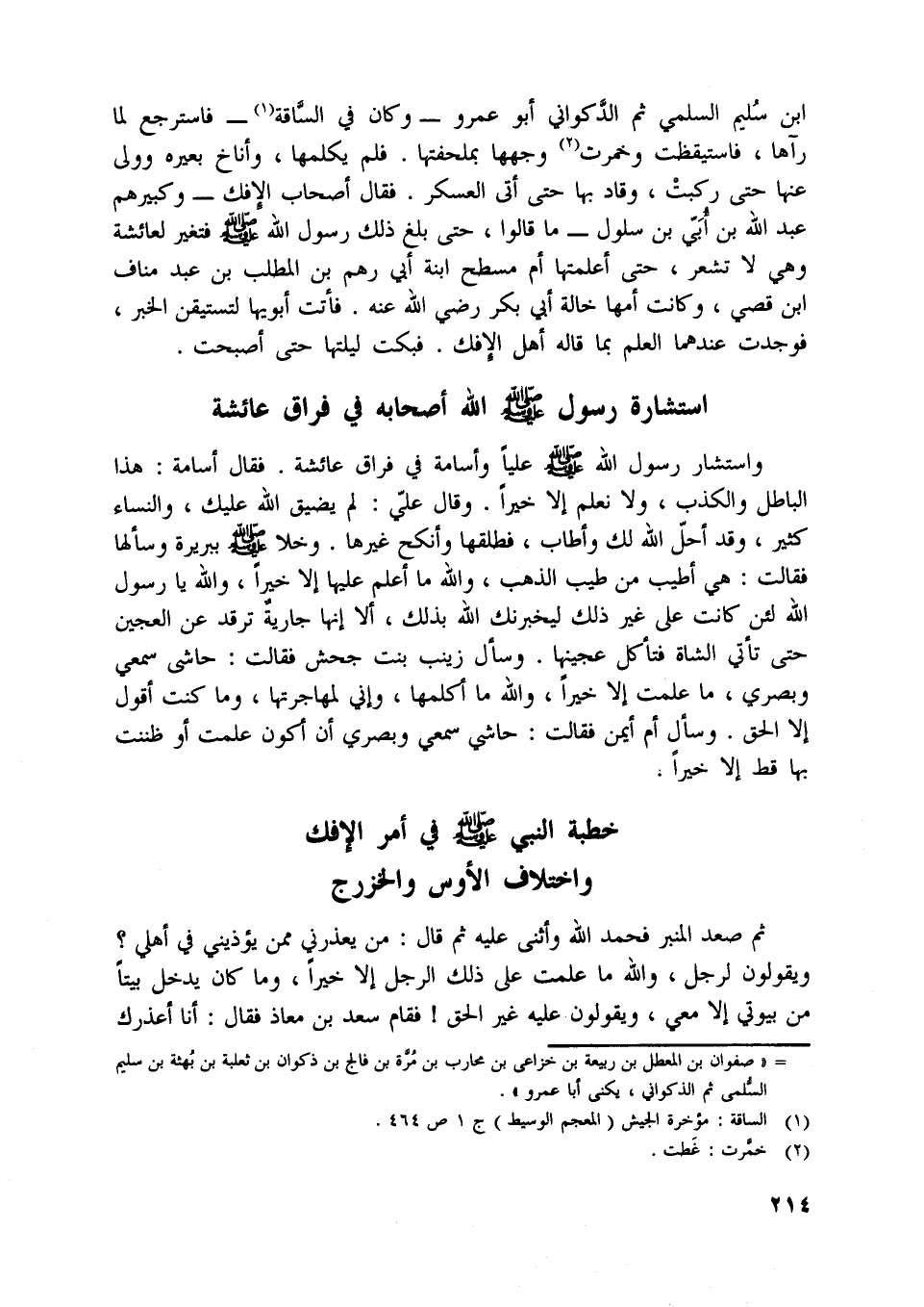 ابن سليم السلمي ثم الذّكواني أبو عمرو- وكان في السّاقة [ (1) ]- فاسترجع لما رآها، فاستيقظت وخمرت [ (2) ] وجهها بملحفتها. فلم يكلمها، وأناخ بعيره وولى عنها حتى ركبت، وقاد بها حتى أتى العسكر. فقال أصحاب الإفك- وكبيرهم عبد اللَّه بن أبيّ بن سلول- ما قالوا، حتى بلغ ذلك رسول اللَّه صلّى اللَّه عليه وسلّم فتغير لعائشة وهي لا تشعر، حتى أعلمتها أم مسطح ابنة أبي رهم بن المطلب بن عبد مناف ابن قصي، وكانت أمها خالة أبي بكر رضي اللَّه عنه. فأتت أبويها لتستيقن الخبر، فوجدت عندهما العلم بما قاله أهل الإفك. فبكت ليلتها حتى أصبحت.