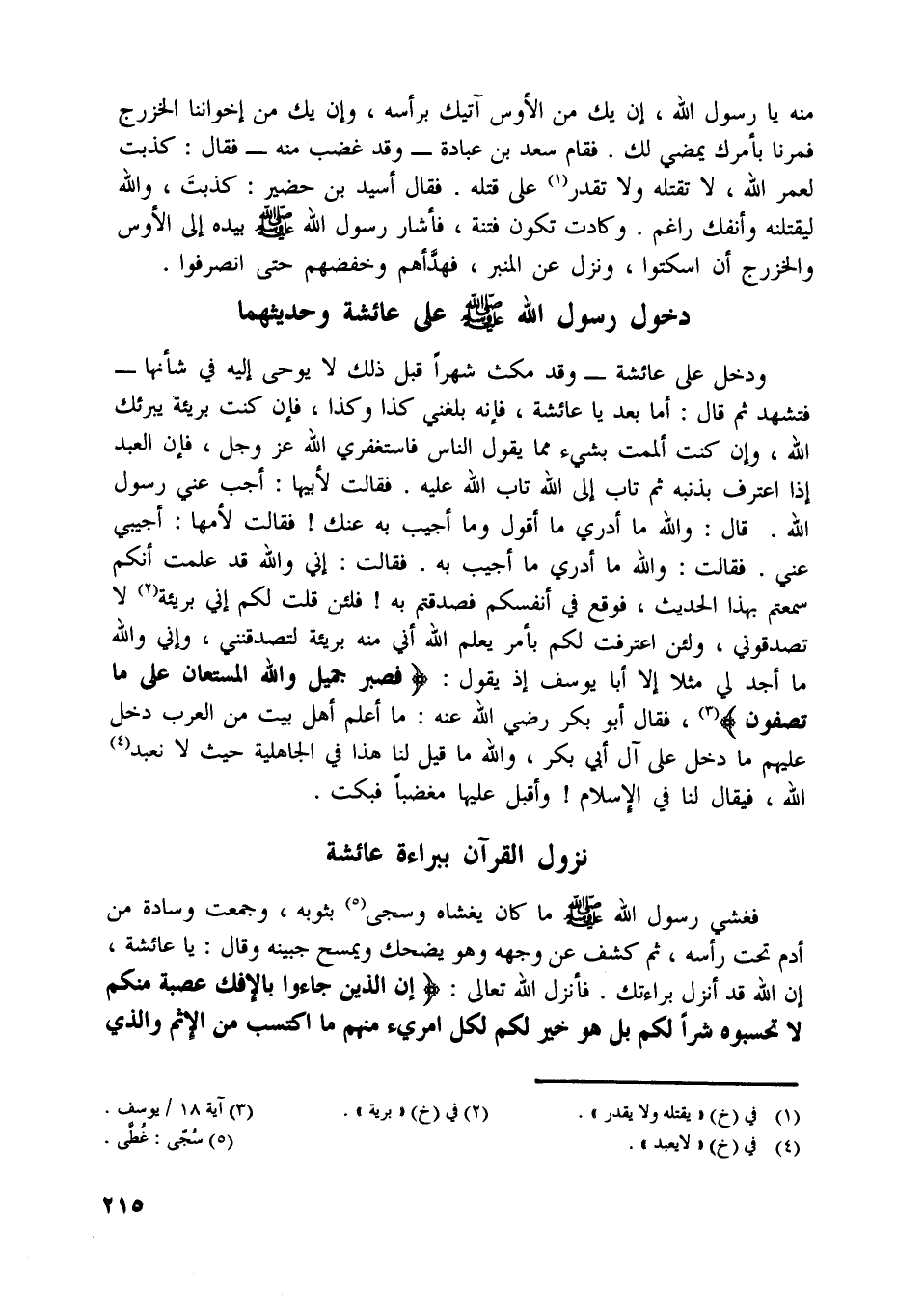 فقالت لأبيها: أجب عني رسول اللَّه. قال: واللَّه ما أدري ما أقول وما أجيب به عنك! فقالت لأمها: أجيبي عني. فقالت: واللَّه ما أدري ما أجيب به. فقالت: إني واللَّه قد علمت أنكم سمعتم بهذا الحديث، فوقع في أنفسكم فصدقتم به! فلئن قلت لكم إني بريئة [ (2) ] لا تصدقوني، ولئن اعترفت لكم بأمر يعلم اللَّه أني منه بريئة لتصدقنني، وإني واللَّه ما أجد لي مثلا إلا أبا يوسف إذ يقول: فَصَبْرٌ جَمِيلٌ وَاللَّهُ الْمُسْتَعانُ عَلى ما تَصِفُونَ [ (3) ] ، فقال أبو بكر رضي اللَّه عنه: ما أعلم أهل بيت من العرب دخل عليهم ما دخل على آل أبي بكر، واللَّه ما قيل لنا هذا في الجاهلية حيث لا نعبد [ (4) ] اللَّه، فيقال لنا في الإسلام! وأقبل عليها مغضبا فبكت.