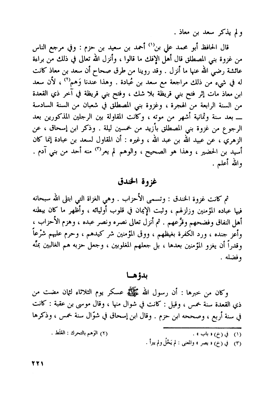 قال الحافظ أبو محمد علي بن [ (1) ] أحمد بن سعيد بن حزم: وفي مرجع الناس من غزوة بني المصطلق قال أهل الإفك ما قالوا، وأنزل اللَّه تعالى في ذلك من براءة عائشة رضي اللَّه عنها ما أنزل. وقد روينا من طرق صحاح أن سعد بن معاذ كانت له في شيء من ذلك مراجعة مع سعد بن عبادة. وهذا عندنا وهم [ (2) ] ، لأن سعد ابن معاذ مات إثر فتح بني قريظة بلا شك، وفتح بني قريظة في آخر ذي القعدة من السنة الرابعة من الهجرة، وغزوة بني المصطلق في شعبان من السنة السادسة- بعد سنة وثمانية أشهر من موته، وكانت المقاولة بين الرجلين المذكورين بعد الرجوع من غزوة بني المصطلق بأزيد من خمسين ليلة. وذكر ابن إسحاق، عن الزهري، عن عبيد اللَّه بن عبد اللَّه، وغيره: أن المقاول لسعد بن عبادة إنما كان أسيد بن الحضير، وهذا هو الصحيح، والوهم لم يعر [ (3) ] منه أحد من بني آدم.
