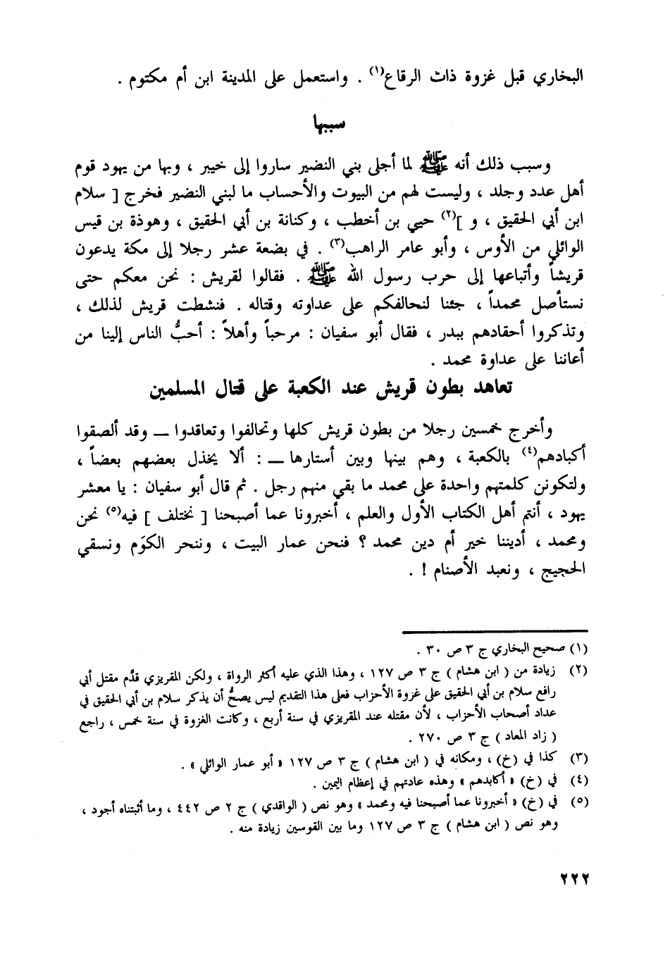 [ (2) ] زيادة من (ابن هشام) ج 3 ص 127، وهذا الّذي عليه أكثر الرواة، ولكن المقريزي قدّم مقتل أبي رافع سلام بن أبي الحقيق على غزوة الأحزاب فعلى هذا التقديم ليس يصحّ أن يذكر سلام بن أبي الحقيق في عداد أصحاب الأحزاب، لأن مقتله عند المقريزي في سنة أربع، وكانت الغزوة في سنة خمس، راجع (زاد المعاد) ج 3 ص 270.