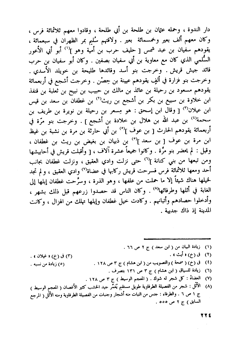 وخرجت بنو فزارة في ألف يقودهم عيينة بن حصن. وخرجت أشجع في أربعمائة يقودهم مسعود بن رحيلة بن عائذ بن مالك بن حبيب بن نبيح بن ثعلبة بن قنفذ ابن خلاوة بن سبيع بن بكر بن أشجع بن ريث [ (2) ] بن غطفان بن سعد بن قيس ابن عيلان [ (3) ] [وقال ابن إسحاق: هو مسعر بن رحيلة بن نويرة بن طريف بن سحمة [ (4) ] بن عبد اللَّه بن هلال بن خلادة بن أشجع] . وخرجت بنو مرّة في أربعمائة يقودهم الحارث [بن عوف] [ (5) ] بن أبي حارثة بن مرة بن نشبة بن غيظ ابن مرة بن عوف [بن سعد] [ (5) ] بن ذبيان بن بغيض بن ريث بن غطفان،: