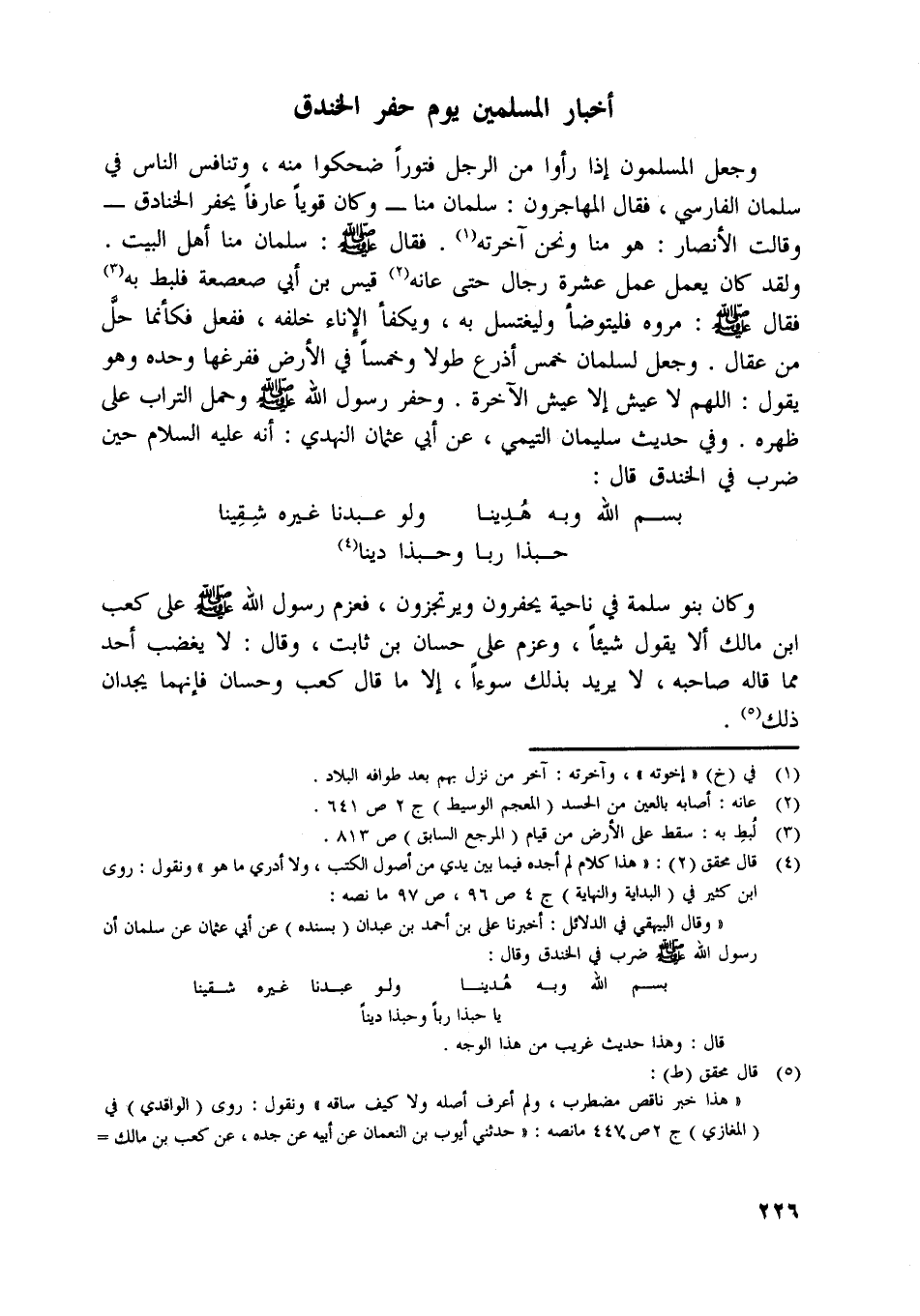 «وقال البيهقي في الدلائل: أخبرنا على بن أحمد بن عبدان (بسنده) عن أبي عثمان عن سلمان أن رسول اللَّه صلّى اللَّه عليه وسلّم ضرب في الخندق وقال: