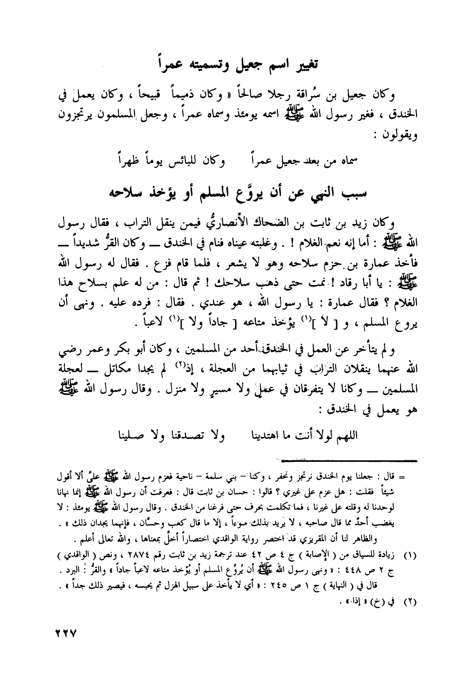 [ (1) ] زيادة للسياق من (الإصابة) ج 4 ص 42 عند ترجمة زيد بن ثابت رقم 2874، ونص (الواقدي) ج 2 ص 448: «ونهى رسول اللَّه صلّى اللَّه عليه وسلّم أن يروّع المسلم أو يؤخذ متاعه لاعبا جادا» والقرّ: البرد.