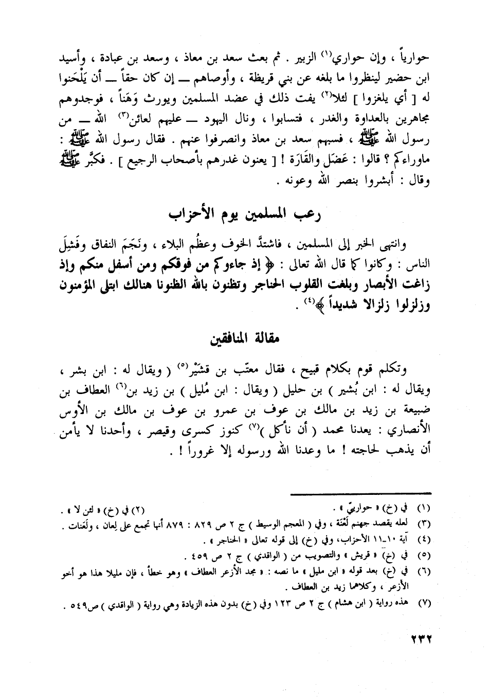 [ (7) ] هذه رواية (ابن هشام) ج 2 ص 123 وفي (خ) بدون هذه الزيادة وهي رواية (الواقدي) ص 549.