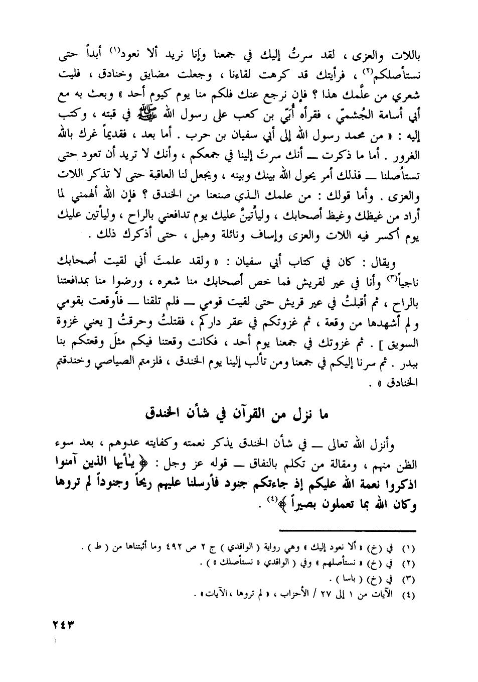 باللات والعزى، لقد سرت إليك في جمعنا وإنا نريد ألا نعود [ (1) ] أبدا حتى نستأصلكم [ (2) ] ، فرأيتك قد كرهت لقاءنا، وجعلت مضايق وخنادق، فليت شعري من علّمك هذا؟ فإن نرجع عنك فلكم منا يوم كيوم أحد» وبعث به مع أبي أسامة الجشميّ، فقرأه أبيّ بن كعب على رسول اللَّه صلّى اللَّه عليه وسلّم في قبته،