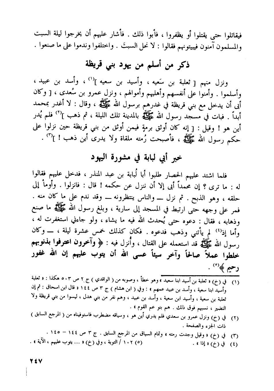[ (1) ] في (خ) «ثعلبة بن أسيد ابنا سعيد» وهو خطأ، وصوبه من (الواقدي) ج 2 ص 503 هكذا: «ثعلبة وأسيد ابنا سعية، وأسد بن عبيد عمهم» : وفي (ابن هشام) ج 3 ص 144 «قال ابن إسحاق: ثم إن ثعلبة بن سعية، وأسيد ابن سعية، وأسد بن عبيد، وهم نفر من بني هدل، ليسوا من بني قريظة ولا النضير، نسبهم فوق ذلك. هم بنو عم القوم» .