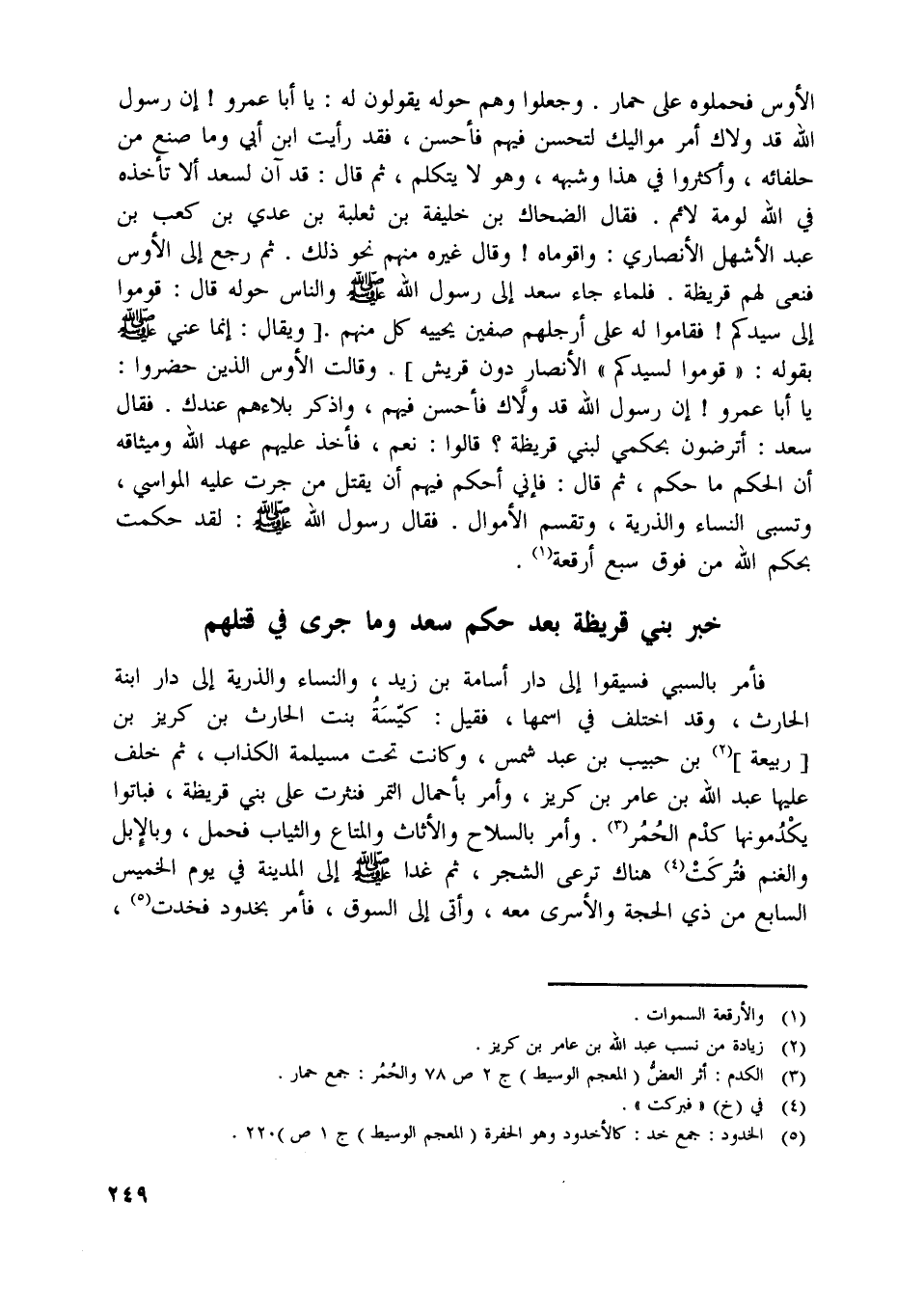 الأوس فحملوه على حمار. وجعلوا وهم حوله يقولون له: يا أبا عمرو! إن رسول اللَّه قد ولاك أمر مواليك لتحسن فيهم فأحسن، فقد رأيت ابن أبي وما صنع من حلفائه، وأكثروا في هذا وشبهه، وهو لا يتكلم، ثم قال: قد آن لسعد ألا تأخذه في اللَّه لومة لائم. فقال الضحاك بن خليفة بن ثعلبة بن عدي بن كعب بن عبد الأشهل الأنصاري: وا قوماه! وقال غيره منهم نحو ذلك. ثم رجع إلى الأوس فنعى لهم قريظة.