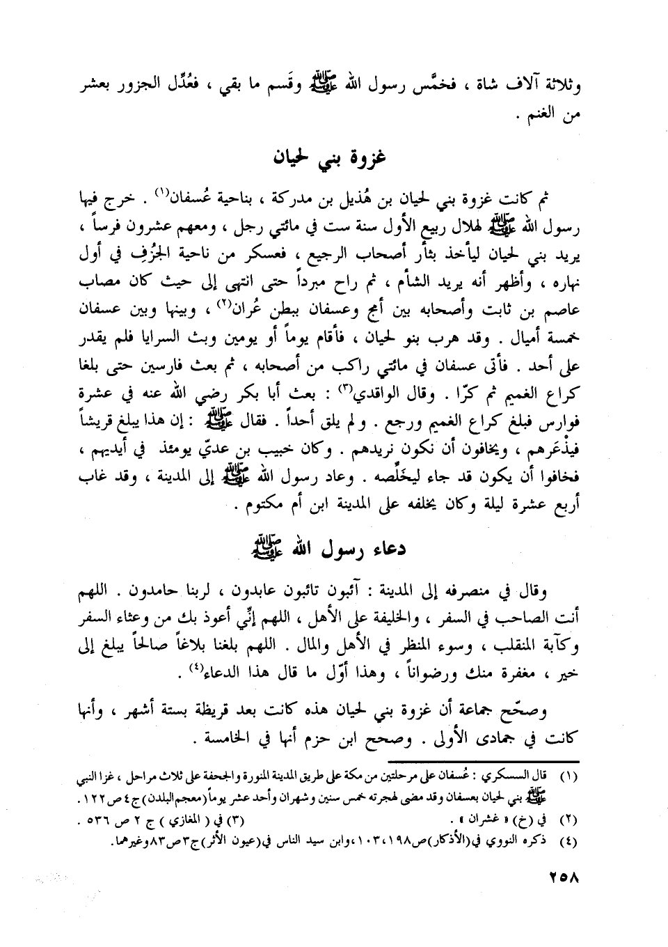 [ (1) ] قال السكري: عسفان على مرحلتين من مكة على طريق المدينة المنورة والجحفة على ثلاث مراحل، غزا النبي صلّى اللَّه عليه وسلّم بني لحيان بعسفان وقد مضى لهجرته خمس سنين وشهران وأحد عشر يوما (معجم البلدان) ج 4 ص 122.