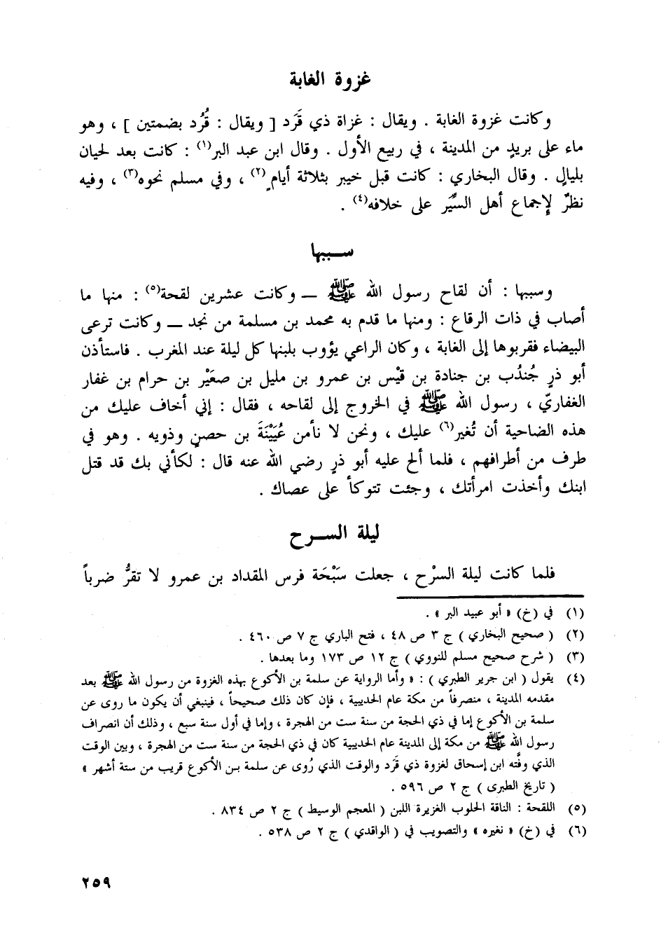 [ (4) ] يقول (ابن جرير الطبري) : «وأما الرواية عن سلمة بن الأكوع بهذه الغزوة من رسول اللَّه صلّى اللَّه عليه وسلّم بعد مقدمة المدينة، منصرفا من مكة عام الحديبيّة، فإن كان ذلك صحيحا، فينبغي أن يكون ما روى عن سلمة بن الأكوع إما في ذي الحجة من سنة ست من الهجرة، وإما في أول سنة سبع، وذلك أن انصراف رسول اللَّه صلّى اللَّه عليه وسلّم من مكة إلى المدينة عام الحديبيّة كان في ذي الحجة من سنة ست من الهجرة، وبين الوقت الّذي وقّته ابن إسحاق لغزوة ذي قرد والوقت الّذي روى عن سلمة بن الأكوع قريب من ستة أشهر» (تاريخ الطبري) ج 2 ص 596.