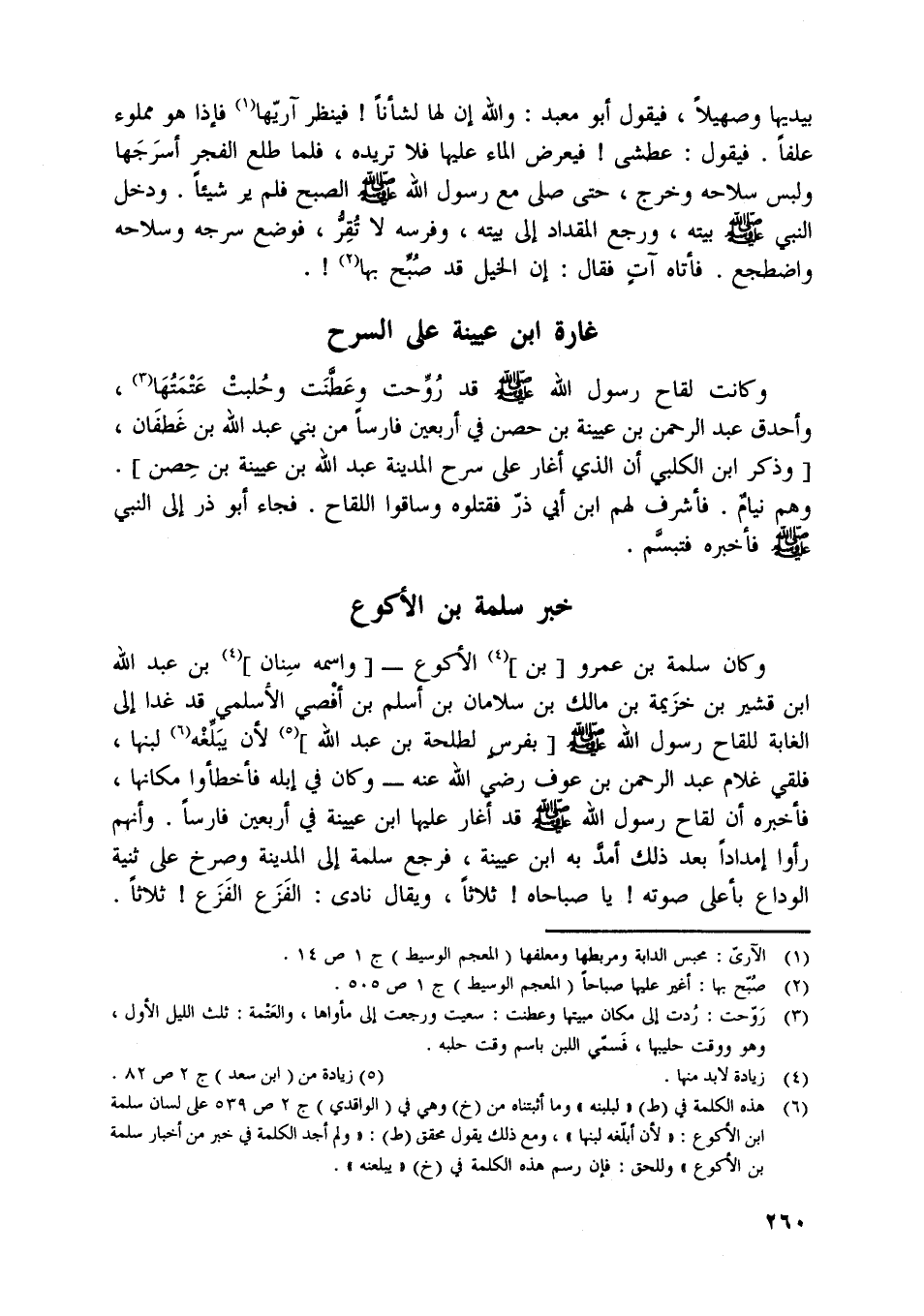 [ (6) ] هذه الكلمة في (ط) «لبلبنه» وما أثبتناه من (خ) وهي في (الواقدي) ج 2 ص 539 على لسان سلمة ابن الأكوع: «لأن أبلّغه لبنها» ، ومع ذلك يقول محقق (ط) : «ولم أجد الكلمة في خبر من أخبار سلمة بن الأكوع» وللحق: فإن رسم هذه الكلمة في (خ) «يبلعنه» .